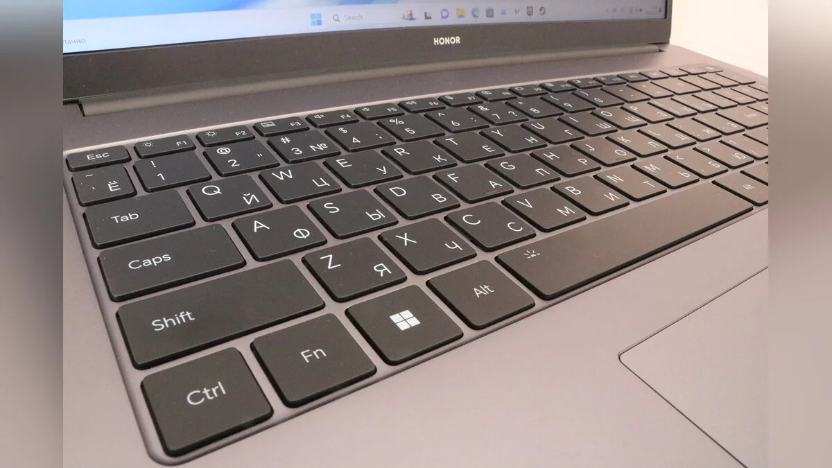 Как мы уже отметили, ноутбук в целом выполнен в строгом дизайне, чтобы отлично смотрелся на столе во время условного «съезда совета директоров». Корпус хоть и отлит из металла, но из-за того, что верхняя крышка сделана максимально тонкой, всё же немного «играет» по диагонали при нажимах. А еще лэптоп не получится открыть одной рукой без придерживания основания. Кроме того, в силу монотонности корпуса, постоянно путаешься, какой именно стороной нужно поставить ноутбук перед началом работы — интуитивно ставишь логотипом HONOR к себе, и в итоге компьютер не открыть. Нужно помнить, что правильное положение текста — вверх тормашками, дабы при открытии логотип смогли считать все окружающие. С одной стороны логично, а с другой — на десятый раз начинаешь мысленно чертыхаться.