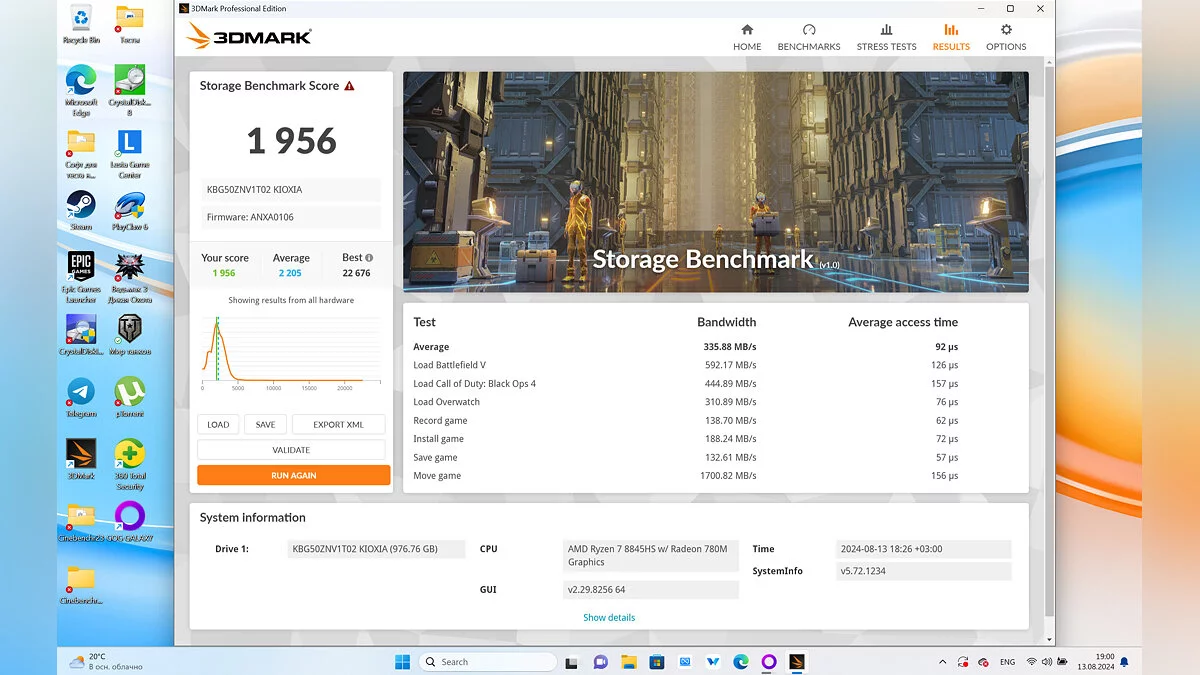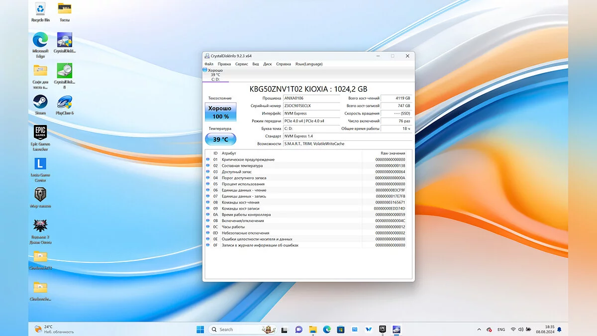 - Дисковая подсистема: 1×SSD 1 ТБ (Kioxia KBG50ZNV1T02), M.2 2280, NVMe 1.4, PCIe 4.0 x4; есть версии на 512 Гб и 2 Тб;
