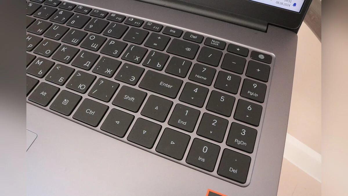 Перейдем к клавиатуре, она здесь мембранного типа и с блоком цифровых клавиш. Её тоже можно похвалить за очень тихий, четкий и мягкий ход клавиш (1,5 мм). Отрадно видеть, что кнопки со стрелками не усеченные, а полноценные — и в целом все клавиши сами по себе увеличенного размера (16,5×16,5 мм), как правило на ноутбуках они меньше. Если вы только осваиваете слепой набор, клавиатура будет идеальным полигоном для практики. А вот правый Shift мог бы быть и подлиннее, но это придирки.