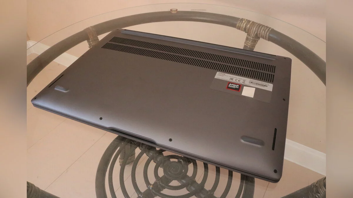 На основании корпуса все лаконично: две линии вентиляционных решеток и единая прорезиненная подставка по верхней грани. Примечательно, что она не шатается и не отваливается, как у нашего недавнего подопытного DIGMA PRO Fortis M — тут всё сделано нормально! Пара стереодинамиков скрыта за двумя вертикальными прорезями: мощность всего 2 ватта каждый, но зато они установлены внутри корпуса на виброподвесах, что добавляет звуку объема. А больше смотреть снизу не на что, равно как и залезть в недра по-быстрому не получится, открывающихся лючков на болтах не предусмотрено. Чтобы добавить второй SSD — а место под него внутри все же есть — придется снять всю заднюю панель.
