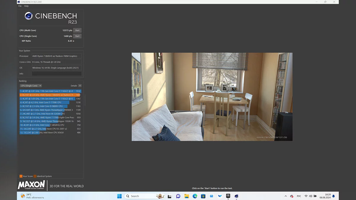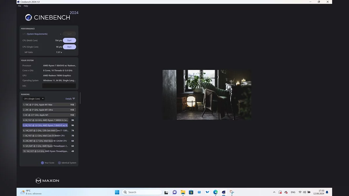 Теперь самое интересное — внутреннее железо. Здесь установлен AMD Ryzen 7 8845 HS. Нетипичный выбор инженеров обусловлен скоростью этого «камня». 8 ядер и 16 потоков на архитектуре Zen 4, максимальная частота на уровне 5,1 ГГц — в наших синтетических тестах процессор показал себя молодцом.