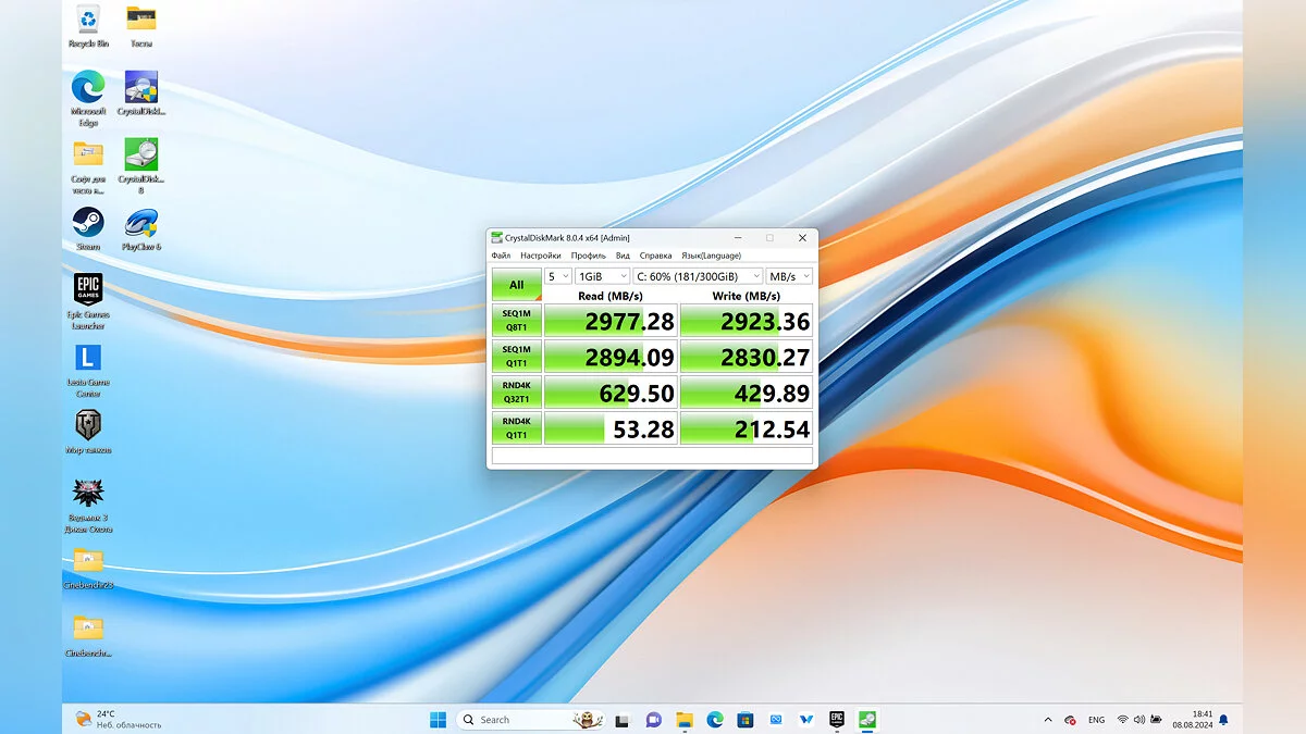 По части SSD производитель выбрал решение от фирмы Kioxia, это «дочка» Toshiba. Работает накопитель шустро: скорость чтения — 5 ГБ/с, записи — 3 ГБ/с.