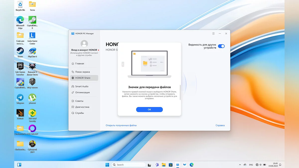 Тачпад далеко не самый большой по индустрии, но и не крохотный — 120×72 мм. Согласно современной моде, левая и правая клавиши невидимые, но нажатия четкие и в то же время мягкие. Тачпад поддерживает управление жестами, в утилите Honor PC Manager немало связанных с ним настроек — будет, с чем поиграться.