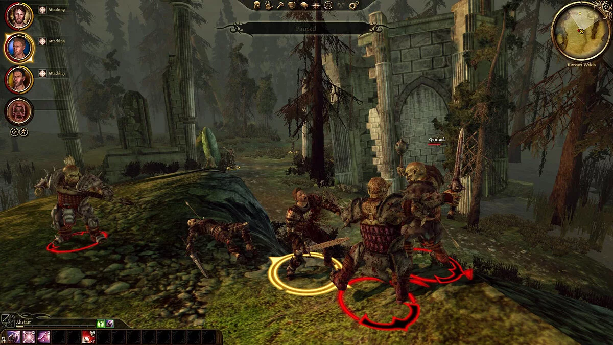 Битви в Dragon Age відбуваються в реальному часі. Ми можемо керувати одразу чотирма бійцями команди, однак перемикатися між ними в розпалі битви не надто зручно. Тому в грі є тактична пауза, яка дозволяє роздати команди товаришам по команді або навіть вибудувати чітку послідовність дій. Причому якщо на низькому рівні складності вона не потрібна, то в хардкорному режимі без неї не обійтися.