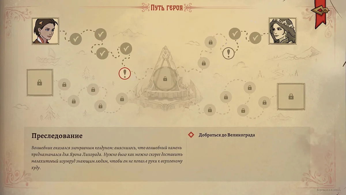 Всього доступно 4 персонажа — Добриня Микитич, Алеша Попович, Василиса Премудра та Варвара-Краса. У кожного з них є власна гілка історії, яка складається з кількох квестів. Однак кожен етап включає значну кількість «кімнат». Розробники заявили, що для повного розуміння відбуваються подій дуже бажано пройти гру всі 4 рази, що автоматично робить ігровий час досить тривалим. В підсумку всі протагоністи повинні зустрітися в одній точці, очевидно, для виконання фінального квесту.