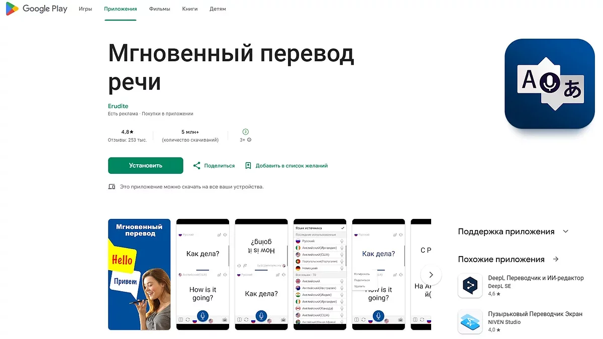 Швидкий і зручний перекладач з підтримкою більше ніж 70 мов світу. У числі функцій — голосовий переклад, розділений екран для спілкування з іноземними співрозмовниками, розпізнавання мови на слух і можливість перекладу написів на картинках і фото. Є офлайн-режим на випадок, якщо не буде зв'язку.