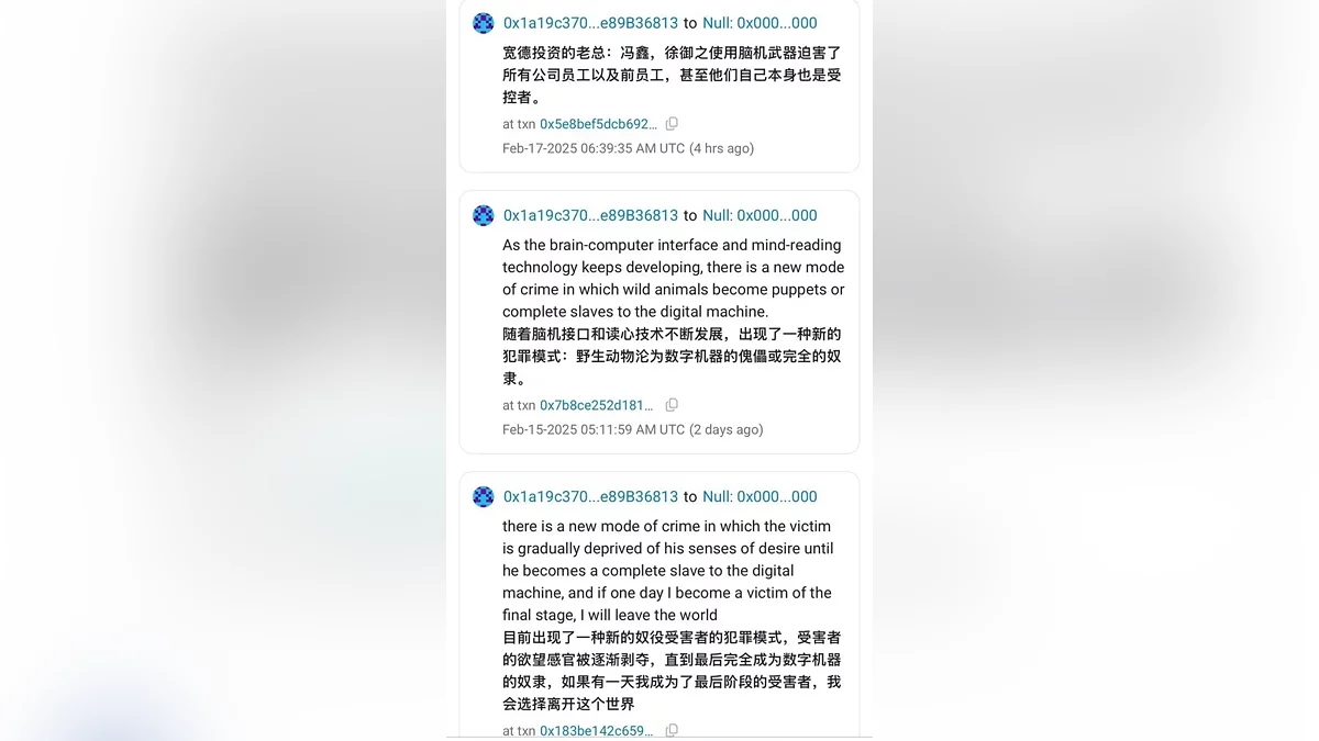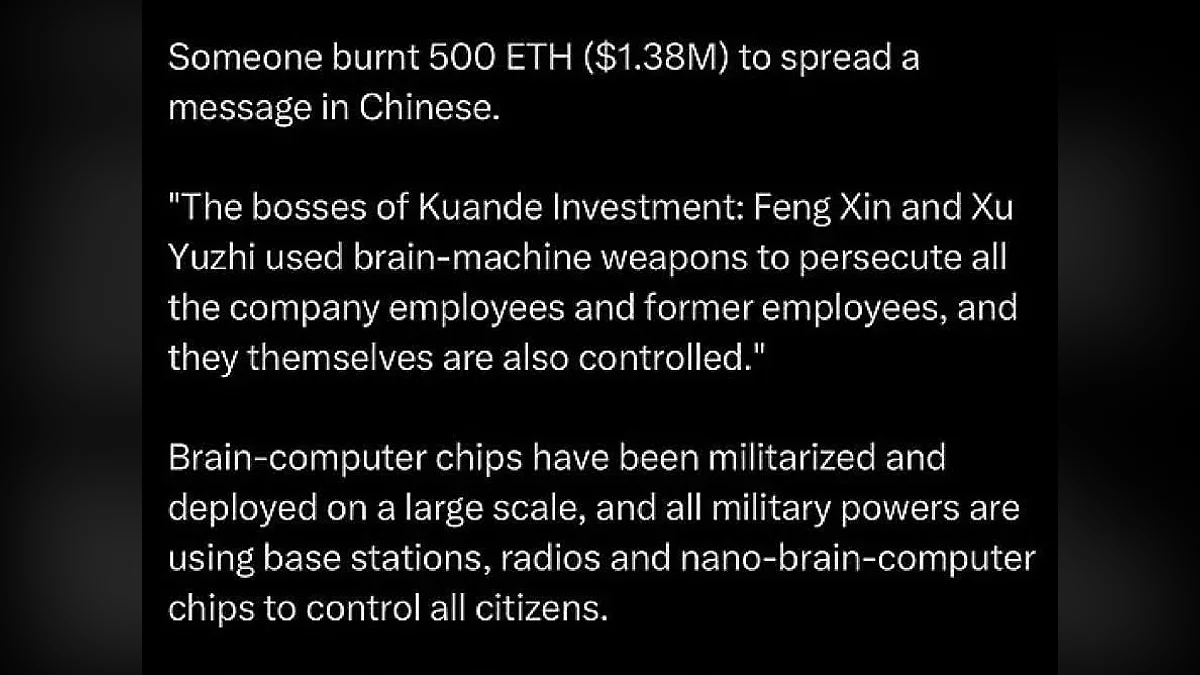 «Генеральні директори Kuande Investment Фен Сінь (Feng Xin) і Сюй Юйчжі (Xu Yuzhi) використовували нейрокомп'ютерну зброю для маніпуляції поточними і колишніми співробітниками компанії. Вони самі також виявилися під чиїмось контролем».