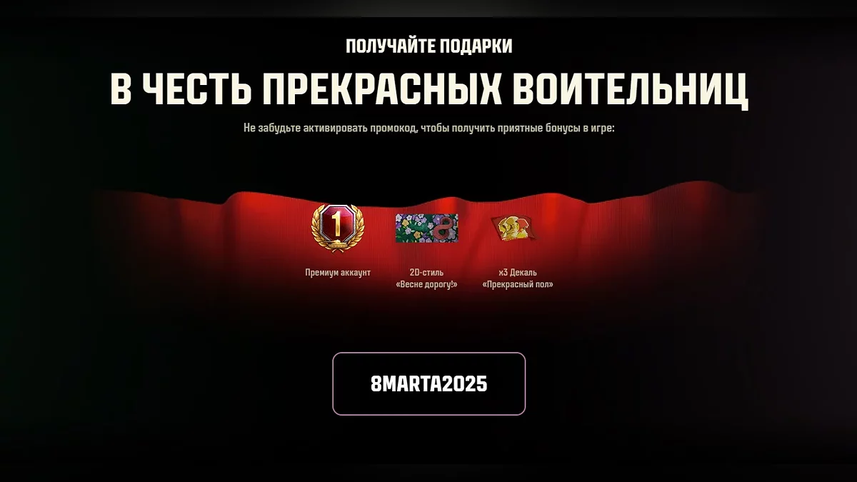 Прямо зараз, 8 березня, в «Світі танків» можна активувати промокод з унікальними подарунками. Він відкриває доступ до трьох декалей під назвою «Прекрасний пол», 2D-стилю «Весні дорогу!» і преміум-акаунту.