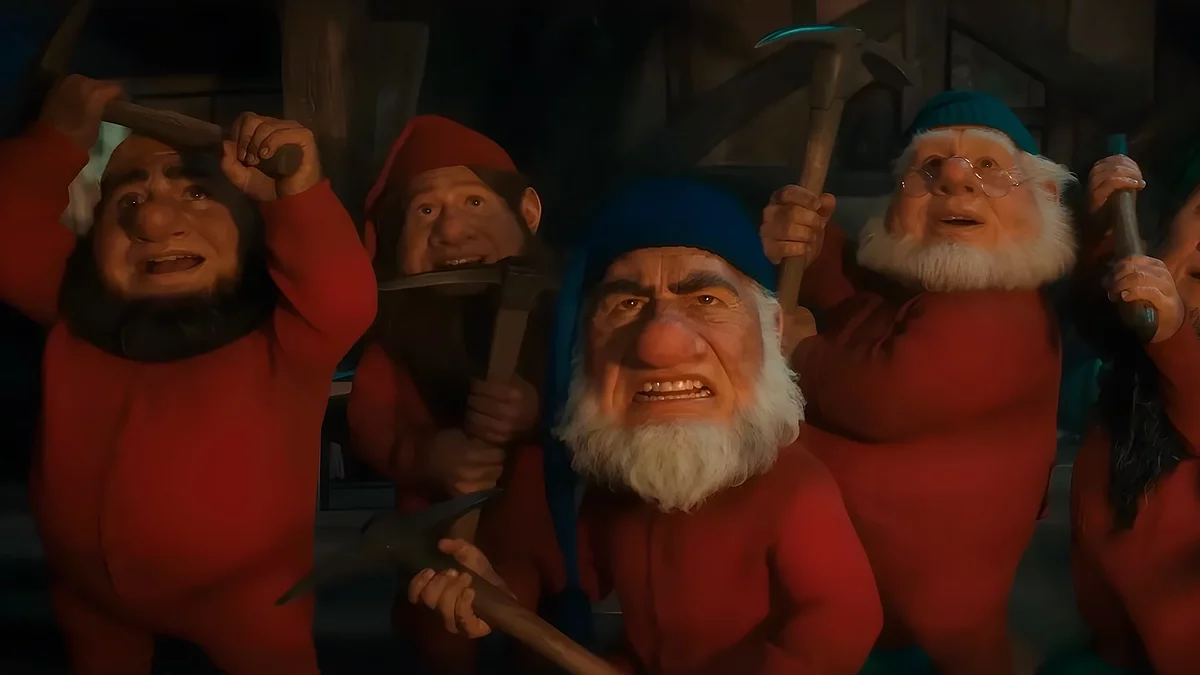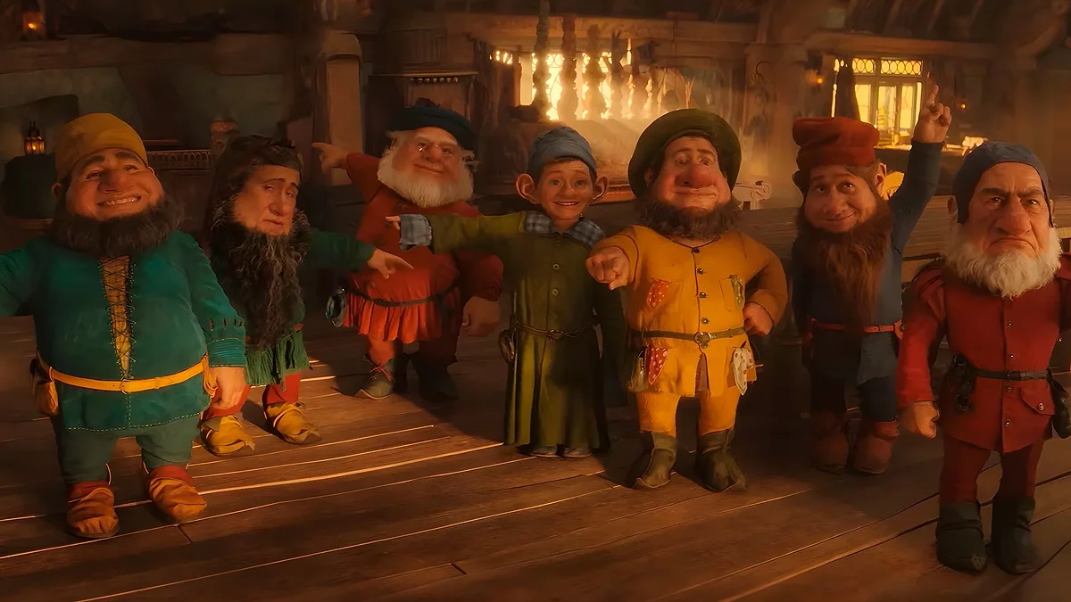 Роль гномів у новій стрічці — це просто функції: дати героїні притулок, зміцнити її характер, оплакувати після кончини. Жодного розкриття характерів, просто самотні холостяки, показані незграбними неряхами, не здатними навести порядок без сталевої жіночої волі. У мультфільмі 1937 року кожному гному приділялося більше уваги, їх особистості були ретельно опрацьовані. І я навіть не хочу коментувати те, наскільки неестественно і незграбно виглядають ці CGI-гноми. Рішення не залучати акторів з карликовістю в такому фільмі одне з найменш професійних.