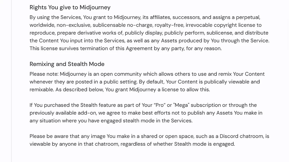 Наприклад, у Midjourney в ліцензійній угоді написано, що ви даєте їй, її правонаступникам і правонаступникам їх правонаступників «безстрокову, всесвітню, невиключну, субліцензовану, безкоштовну, безвідкличну ліцензію» на весь контент, який ви в неї завантажуєте і який створюєте. Т. е. вони можуть публічно демонструвати, відтворювати, змінювати і робити з ним все, що їм хочеться. І при цьому абсолютно безкоштовно, навіть якщо в результаті вони на вашому контенті зароблять «багато грошей» (і мова йде не тільки про створений у нейромережі контент, а й взагалі про будь-який матеріал, який ви в неї завантажуєте). Якщо зараз ви хочете написати коментар, що я занадто параноїк і краще мені піти в печеру і харчуватися пташиним кормом, це вже пропонували в коментарях під другою частиною. Шапочку з фольги теж не варто пропонувати (в третьій частині робив).