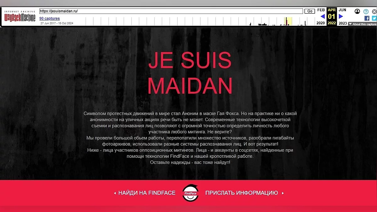 Наприклад, після мітингів у 2017 році відкрився сайт Je Suis Maidan, на якому деанонілися учасники таких заходів. Там були фото з протестів, ПІБ і посилання на профіль ВК. Сайт вже закритий і деякий час пустував (зараз його викупило якесь казино), але завдяки Wayback Machine можна подивитися, яким він був раніше.