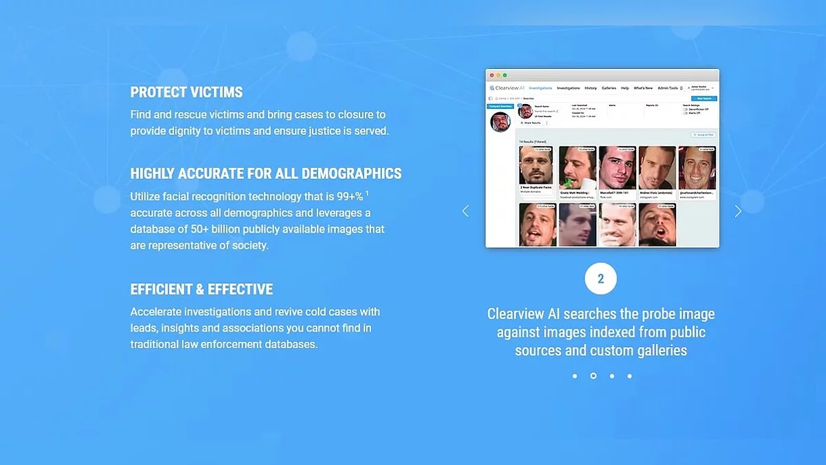 Також у статті згадується і контракт між ФБР і Clearview AI на суму 120 000 доларів. Що таке Clearview AI? Так, нічого особливого. Лише приватна компанія, що надає правоохоронним і державним установам послуги з розпізнавання облич. Згідно з офіційним сайтом, їх база даних складається з 50+ мільярдів облич! Дані зібрані з відкритих джерел, таких як новини, вебсайти з фотографіями, соцмережі (привіт FindFace), а точність розпізнавання складає 99+%. Згідно з The New York Times, дані збиралися зокрема з Facebook, YouTube, Venmo та мільйона інших сайтів (примітно, що на момент написання тієї статті, в 2020 році, база налічувала понад 3 мільярди фото. «За час шляху собака база могла зрости»).