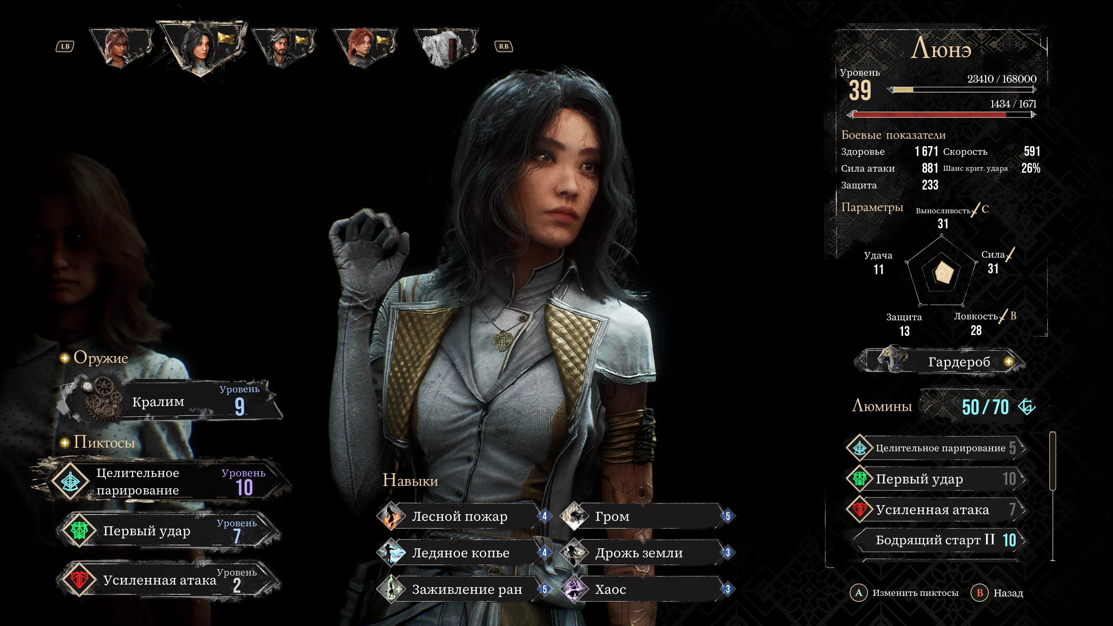 Як ми вже сказали вище, Clair Obscur: Expedition 33 — jRPG з покроковою бойовою системою і тонкою налаштуванням білдів. Всього в загоні три персонажі, тому простір для вибору є, однак це далеко не все. Вивчаючи карту, ви будете шукати корисні предмети, зброю, костюми та зачіски. Останні мають косметичний характер, але зате дозволяють урізноманітнити набридлу зовнішність персонажів.