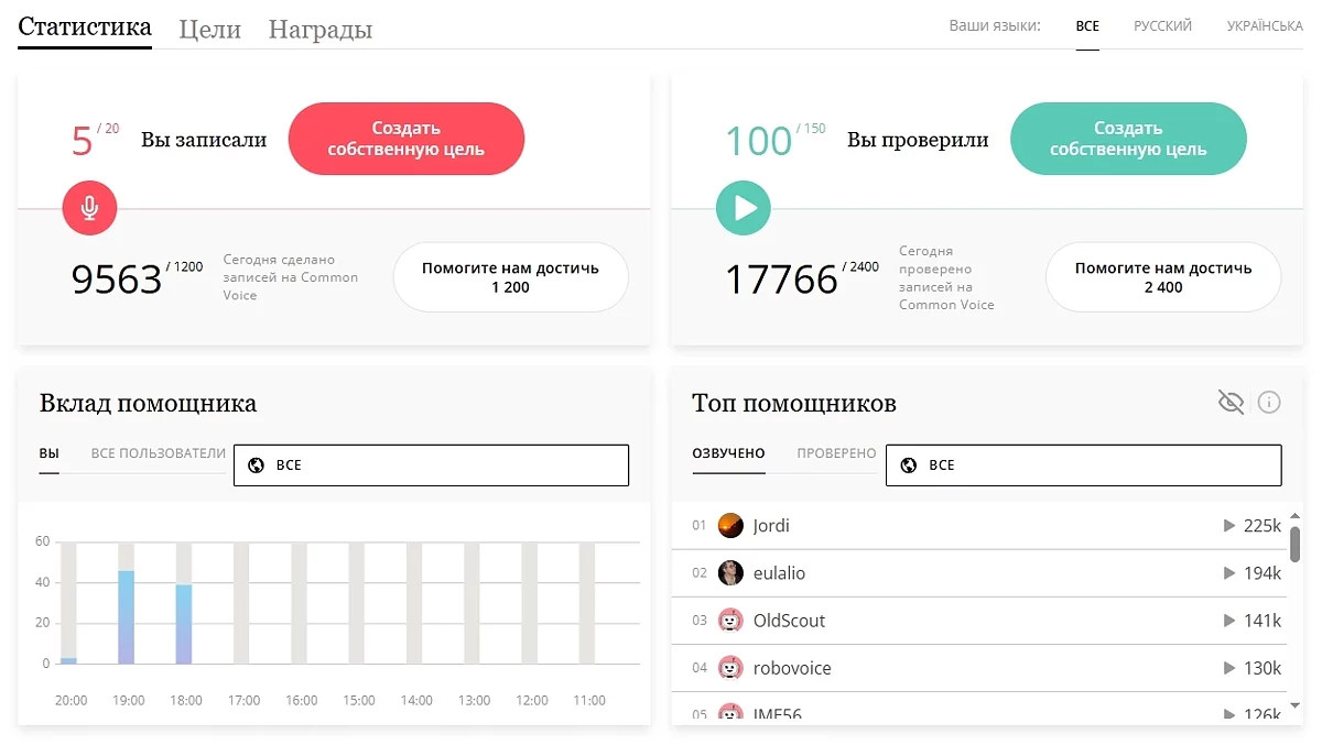 Реєстрація не складна, і інтерфейс інтуїтивно зрозумілий. Для цікавості перевірив близько 100 фраз і ось що з'ясував. Набір даних дуже різноманітний. Є як зашумлені, з нечітким вимовою, так і чисті уривки, зачитані з виразом (як ніби людина записувала уривок у перерві між театральною постановкою і створенням аудіокниги). Стать і вік також різняться (за весь час почув тільки 1 дитячий голос, але, на жаль, він допустив грубу помилку, так що відхилив його варіант).