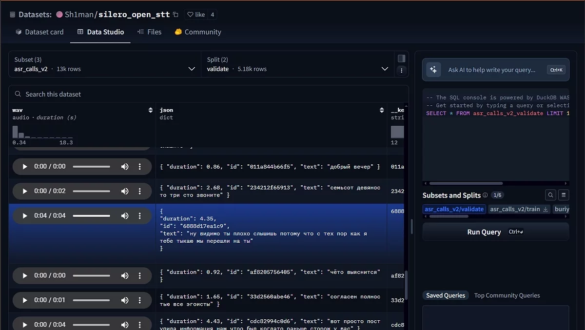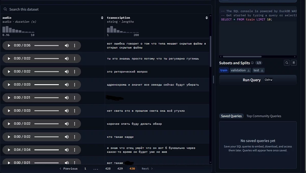 Знайшов я її, коли шерстив HuggingFace на предмет датасетів підозрілого походження. На порталі можна прослухати приклади мови, і щось вони не схожі на те, що могло бути зібрано з добровільної згоди. Вони скоріше схожі на уривки голосових повідомлень: у багатьох є мат, мова жива, сторонні звуки на задньому плані і т. д.