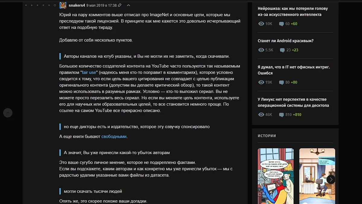 Але особисто у мене такий підхід викликає питання. Документи після шредера все одно можна відновити, записів це теж стосується. І те, що будь-хто інший може скачати ці дані, не скасовує факту, що це з труднощами можна назвати добросовісним використанням. Хоча якщо аудіо анотуються і трохи перероблені для більш ефективного скармлювання нейромережі, то з дуже великою натяжкою може підпадати під fair use. Але в такому випадку все одно залишаються питання до уривків з «пранків»... Сумнівно, але окей.