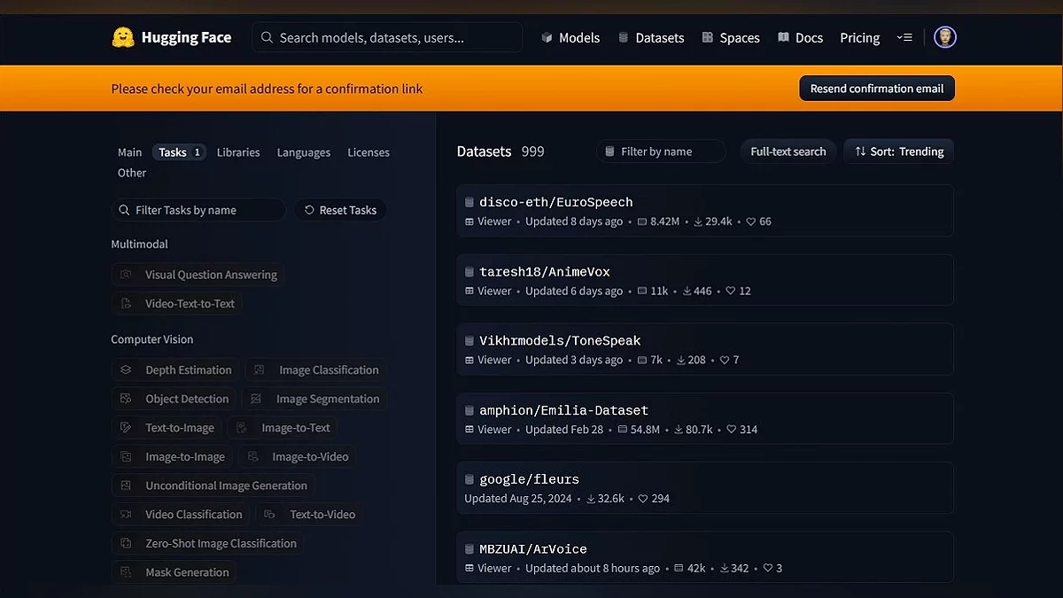 В цілому, якщо дуже коротко, то Hugging Face — це «GitHub для ІІ». На ньому зібрано безліч моделей і датасетів, які можна відфільтрувати за призначенням, мовою, вагою і купою інших параметрів. Також є Spaces — платформа для розгортання систем на базі машинного навчання. Простими словами, вона дозволяє запустити модель на серверах Hugging Face, де будь-який юзер може з нею взаємодіяти. Можливості у представлених моделей найрізноманітніші, від генерації картинок до клонування голосу (більш детально про синтез поговорю в наступних частинах).
