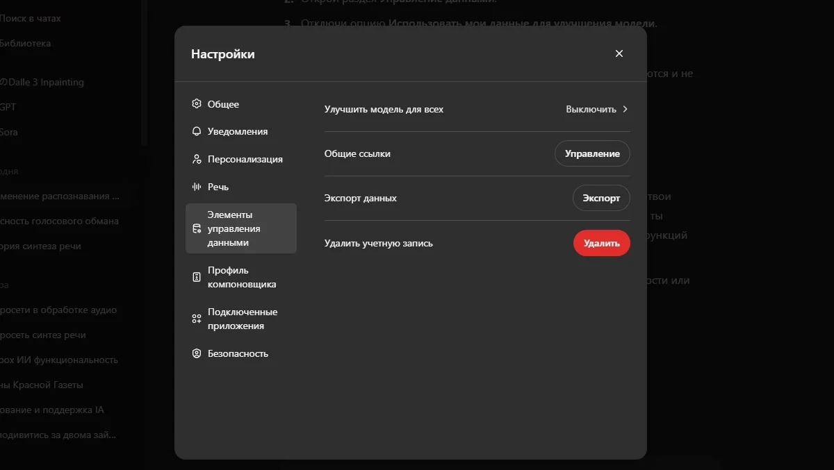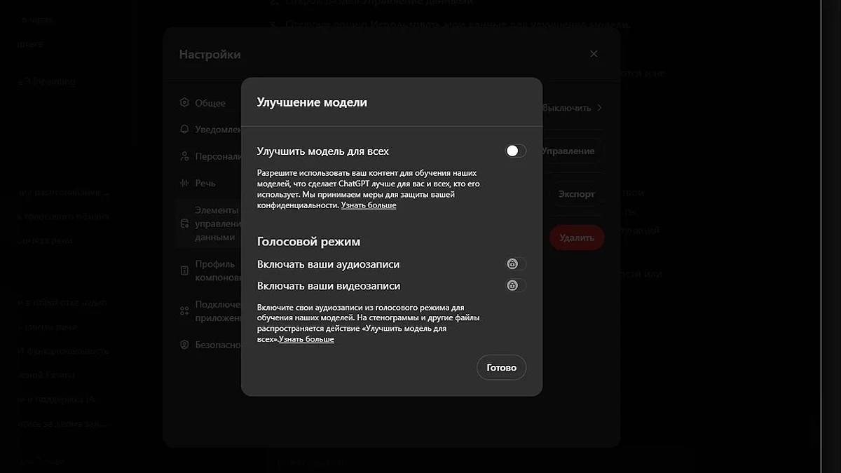 Як з'ясували в попередніх статтях, нейромережі навчаються на ваших даних, але в разі з ChatGPT йому можна заборонити це робити (принаймні, так стверджує сама OpenAI). Для того, щоб мало хто знайшов цю функцію, вона названа не зовсім зрозуміло: «Покращити модель для всіх». Розташована вона в Налаштування → Елементи управління даними → Покращити модель для всіх.
