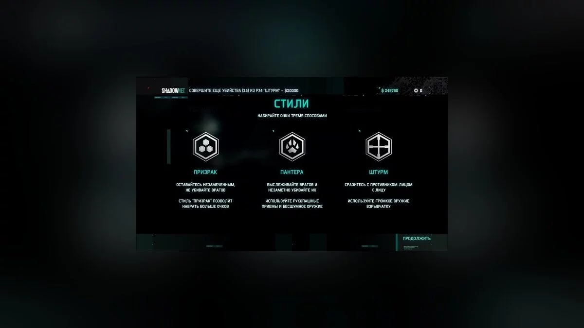 Стилей прохождения в игре три: «призрак», «пантера» и «штурм». Как не трудно догадаться «призрак» — это самый сложный стиль прохождения, но он и вознаграждается лучше всех остальных. Чтобы получить очки в таком стиле нужно бесшумно и незаметно оглушить врага, «пантера» — это средний по сложности стиль прохождения. Он допускает проведение бесшумных убийств и выслеживания врага, а оставаться не замеченным врагом не обязательно, «штурм» — это режим Call of Duty от третьего лица: много взрывов и экшена. В этом стиле больше шума, значит больше очков.