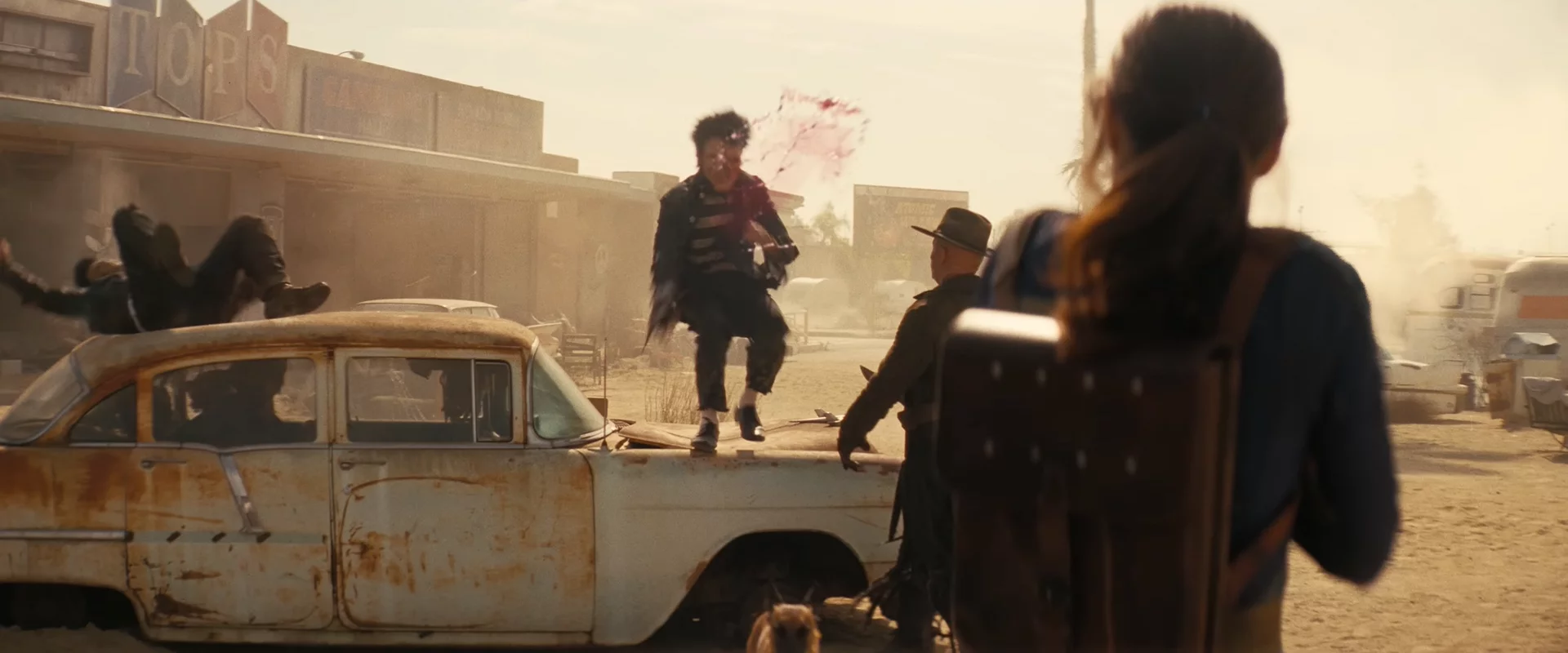 На 2:12 Люсі стріляє в запригнувшого на машину гуля, який одягнений точь-в-точь як деякі з членів банди Королів. Королі, якщо ви раптом забули або не знали, контролюють один з передмість Нью-Вегаса. Вони без розуму від Елвіса Преслі (Elvis Presley): Королі вважають, що до війни він був фігурою майже релігійного масштабу і тому намагаються дотримуватися його стилю моди. Що цікаво: смугасті сорочки, як на гулі з трейлера, носять тільки найближчі товариші Пейсера, одного з лідерів фракції, чиї погляди часто розходяться з іншими Королями.