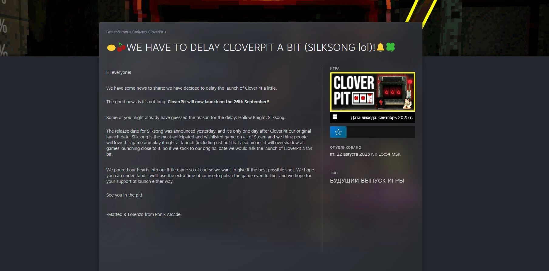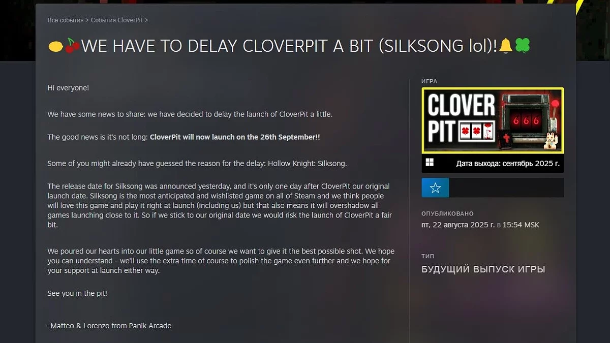 CloverPit— хоррор-гра, що поєднує елементи Balatro і Buckshot Roulette. Спочатку реліз планувався на 3 вересня, але був перенесений на 26 вересня. Розробники пояснили це тим, що хочуть дати гравцям можливість в повній мірі оцінити їхній проект без конкуренції з масштабним релізом.