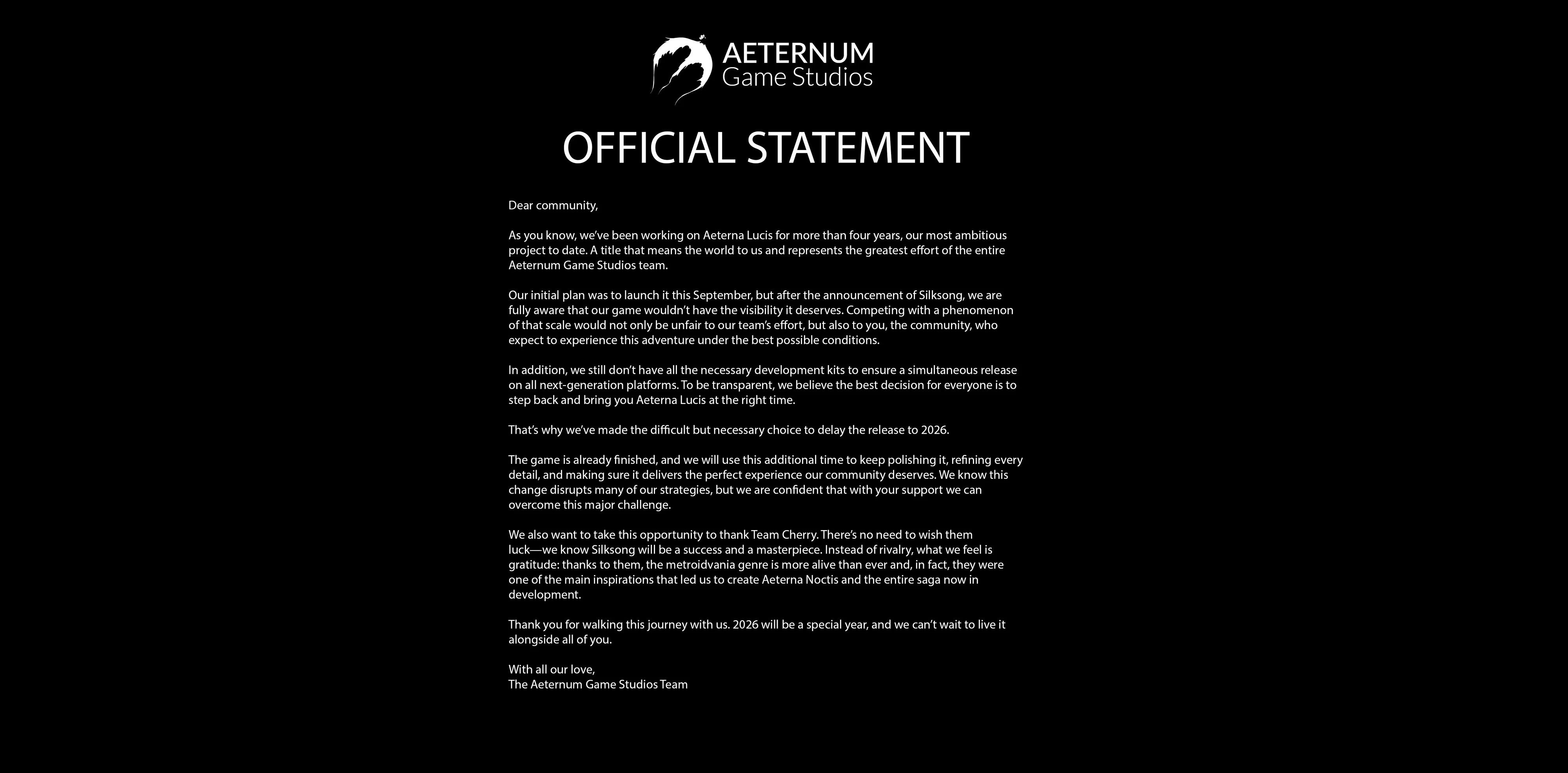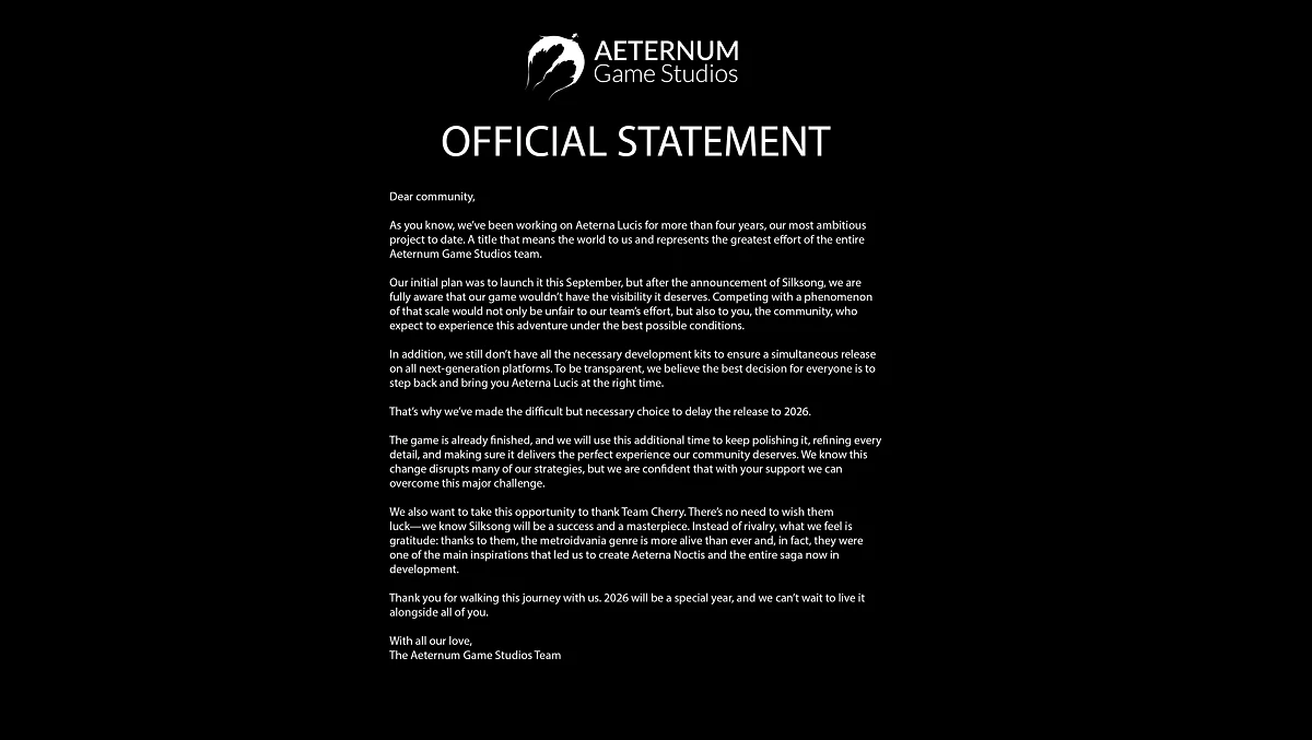 Aeterna Lucis — метроїдванія з акцентом на динамічні бої. Проєкт, над яким команда працювала 4 роки, також зіткнувся з необхідністю перенесення приблизно до 2026 року. Примітно, що розробники висловили повагу команді Team Cherry, зазначивши їх внесок у розвиток жанру.