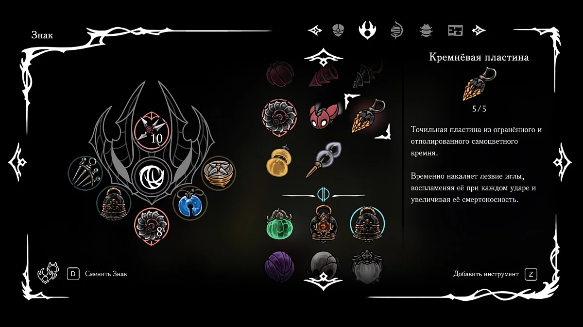 «Інструменти» — це заміна амулетів з Hollow Knight. По суті, змін мало: тут є інструмент-компас, інструмент для захисту під час лікування та інші. Однак є нововведення. У процесі проходження ми відкриваємо знаки, кожен з яких дає унікальні здібності і змінює атаки голкою. Інструменти діляться на три типи: зброя (червоні), для дослідження (жовті) і різні (сині). У кожного знака є певна кількість осередків для кожного типу. Наприклад, у знака «Звір» немає синіх осередків, а у «Відьми» — немає жовтих.