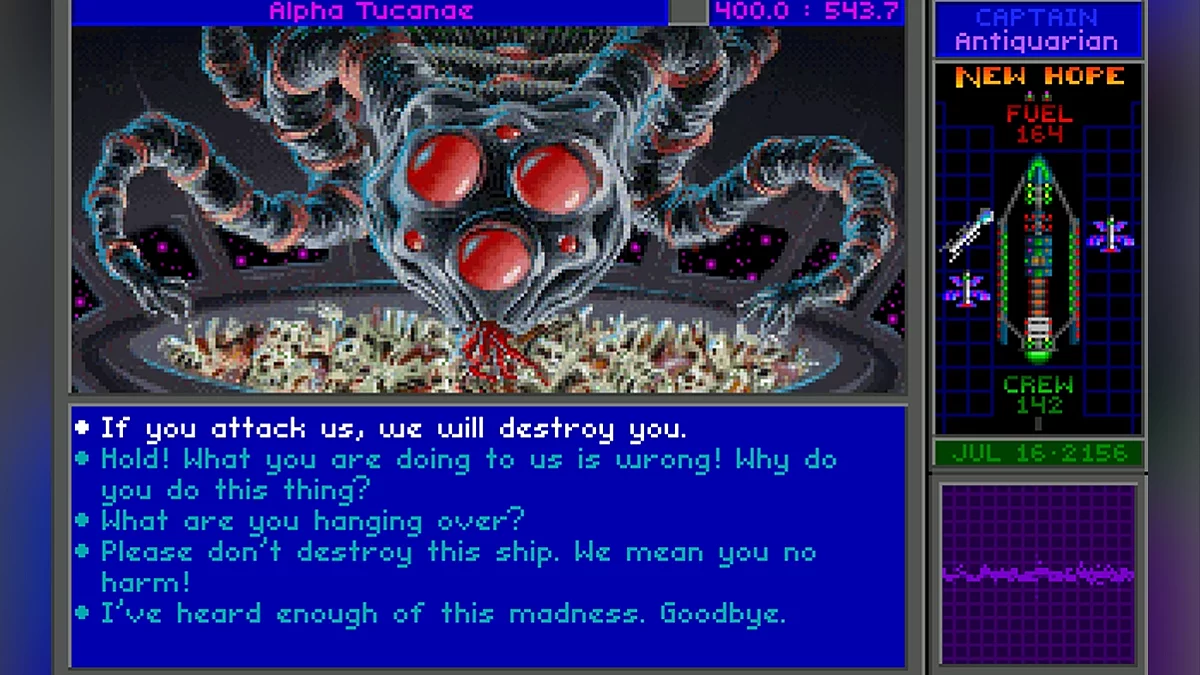 Для прикладу, можна було укласти союз з мілітаристськими Йехатами, або спробувати переконати жорстоких Ільрафів у своїх добрих намірах, або обережно вести переговори з роботами Ммрнмхрм, і так, кожен вибір мав значення. Не в сенсі умовного «+1 до дипломатії», а в тому, що від твоїх слів залежало, станеш ти союзником для них чи ворогом, отримаєш ключову інформацію чи назавжди втратиш довіру цілої раси. Саме ця глибина, заснована не на механіці репутації, а на культурному різноманітті та усвідомленому виборі, зробила Star Control II за відчуттям і атмосферою такою унікальною. Гра перетворювала НПС не в перешкоду на шляху до мети, а в повноцінного співрозмовника, іноді дурного, іноді зловісного, але завжди живого.