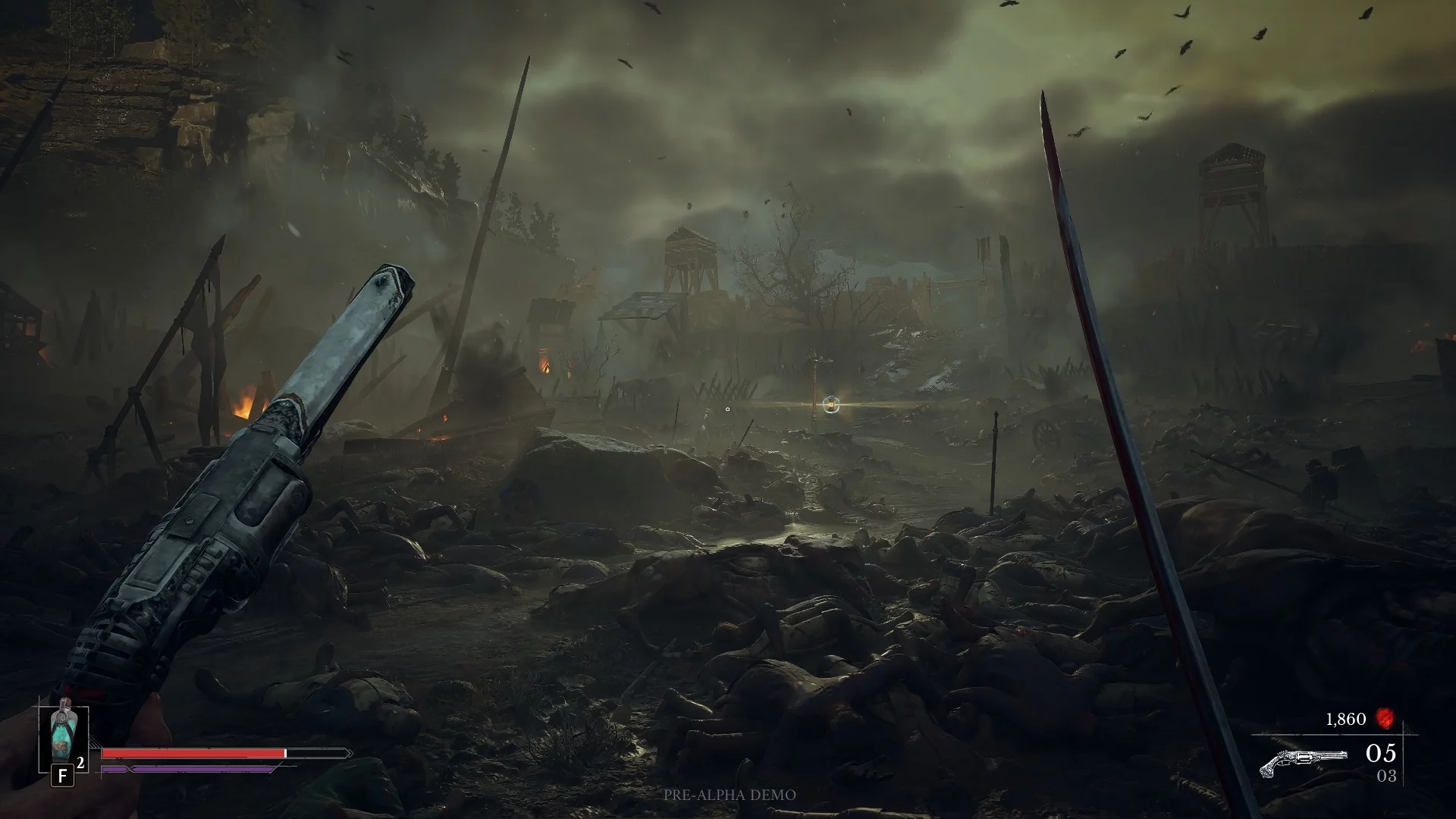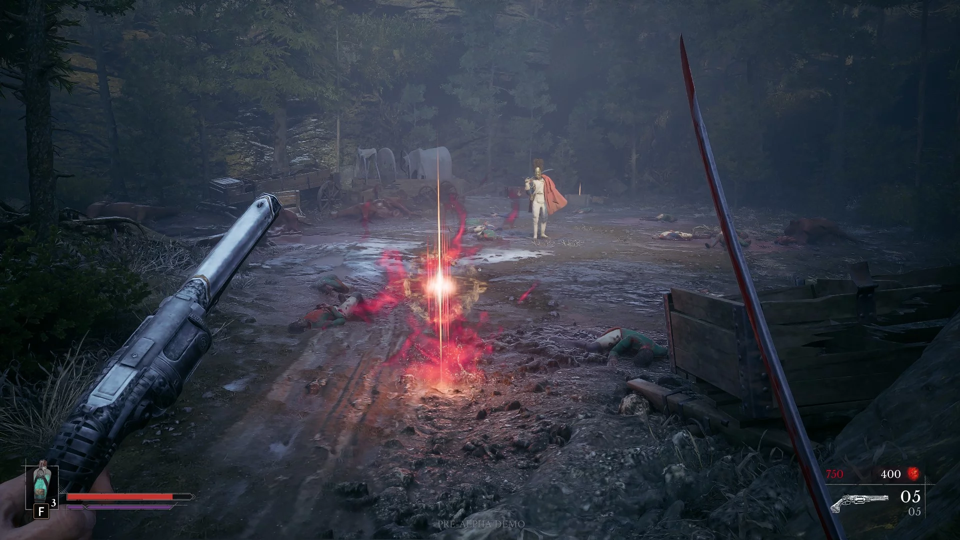 Унікальний сеттинг — перше, що кидалося в очі в трейлерах, і це дійсно один з найцікавіших елементів Valor Mortis. Автори чудово попрацювали з художнім стилем і атмосферою. В пре-альфі є момент, коли геймер потрапляє на більш відкриту місцевість, яка по суті є полем бою між двома арміями. І ось ти з шаблею в одній руці і пістолетом в іншій йдеш в невідомому напрямку серед тліючих вогнів і останків павших бійців, намагаючись розгледіти в тумані, які небезпеки чекають попереду. Лише щоб натрапити на солдата, який різко видає пронизливий вой, викривляється назад і починає бігти до тебе на четвереньках.