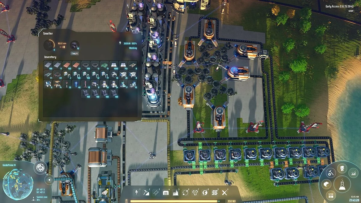 Потім — електрична агонія. Сонячні панелі та вітряки рятували недовго: додаси пару фабрик — і знову blackout. Спалювати вугілля? Дика марнотратність, на мій погляд: графіт і штучні алмази важливіші. «Озарення!» — подумав я і обвів екватор обручем з панелей і генераторів. Це коштувало купу ресурсів, виглядало убого, але дефіцит усунув... Ще п’ять годин марно. Проте, електростанції від водневих і дейтерієвих стержнів мені не подобаються досі. Зараз? Зараз я мчу на планету з вулканічним біомом, а основа для мережі — набагато потужніші електростанції, що живляться від розпеченої лави.