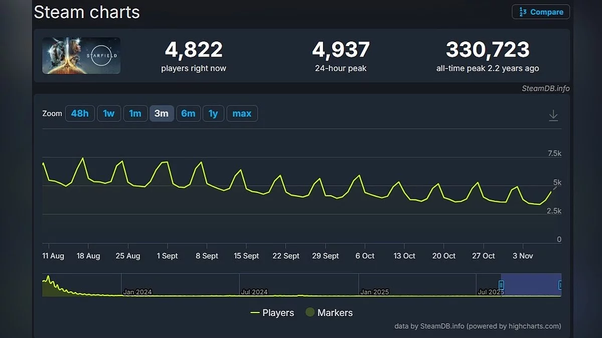 Перші, найяскравіші претензії гравців до гри стосувалися як технічного стану гри, так і обмежень, які обумовлює по суті застарілий на момент виходу движок Creation Engine 2. Огромний світ з тисячею планет насправді виявився зовсім не відкритим, а фрагментованим на величезну кількість окремих локацій, між якими практично незмінно гравця очікувала завантаження. І якщо гру встановити не на швидкий SSD, а на звичайний хард, то ці завантаження своєю кількістю і тривалістю здатні вивести з себе навіть найфлегматичніших гравців. Що говорити, навіть у мінімальних вимогах до системи вказувався only SSD. Зараз, на виході 2025 року, це швидше перетворюється в норму, але в 2023 році мейнстрімом зовсім не було. Крім того, продуктивність на ПК після релізу також бажала кращого, гра при досить застарілій (поклавши руку на серце) картинці вміла гальмувати і фризити на найрізноманітніших системах, в тому числі і досить потужних. Тодд Говард на це відреагував зі властивою йому лаконічністю — порекомендував гравцям придбати нові комп'ютери, що відповідають сучасним вимогам. Втім, що стосується технічного стану, розробники не сиділи склавши руки. Потрібно тут віддати їм належне. У найближчі після релізу місяці оперативно клепали патчі, що покращують продуктивність і виправляють більшість технічних проблем, і особисто у мене зараз в цьому плані до гри претензій немає жодних, при дуже середньому за нинішніми мірками ПК. Здавалося б, ось воно, щастя. Грай і насолоджуйся, не викручуючи налаштування для отримання плавної і комфортної гри. Але онлайн в Стімі впевнено котився вниз, як і оцінка гравців, і гра почала поступово зникати з інформаційного поля. Чому ж так сталося?