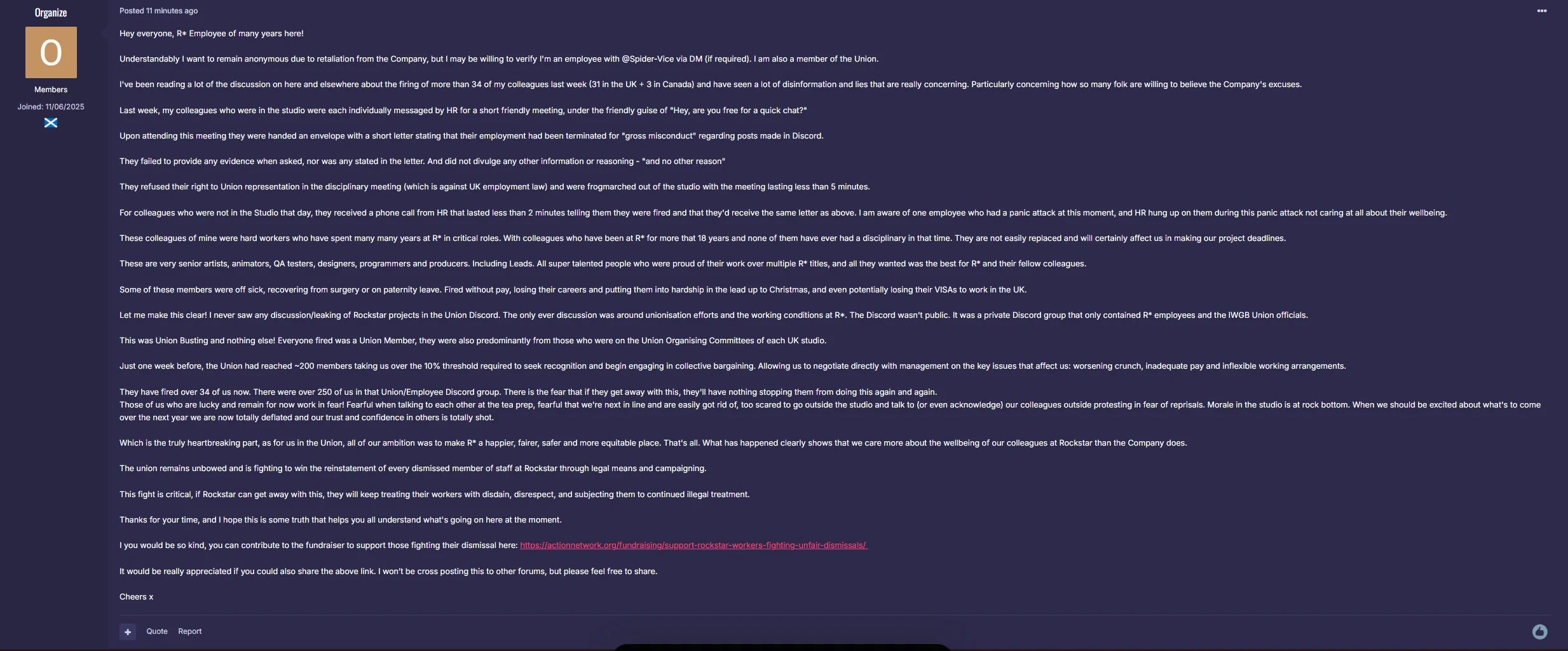 Пост надає важливий додатковий контекст скандалу. Автор коментаря пише, що було звільнено 34 людини (31 у Великій Британії та 3 в Канаді). Після коротких зустрічей з HR, які тривали в середньому не більше п'яти хвилин, людей буквально виводили з офісу. Згідно з анонімним користувачем, скорочені співробітники «були досвідченими працівниками, багато з яких мали десятиліття стажу в Rockstar, деякі — понад 18 років без єдиного дисциплінарного стягнення. Це провідні художники, аніматори, тестувальники, дизайнери, програмісти та продюсери».