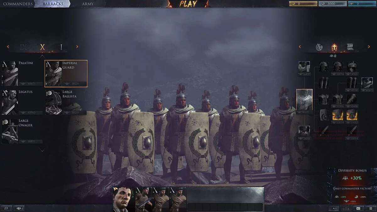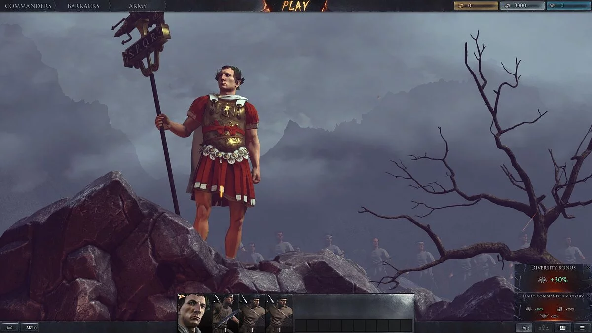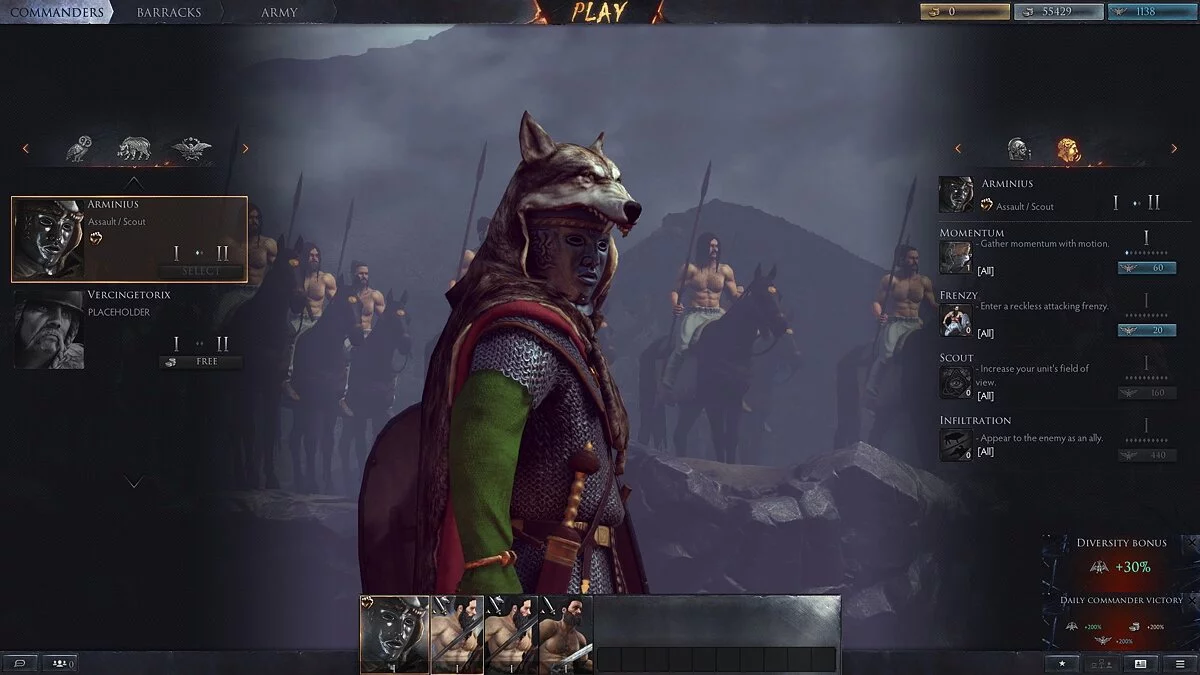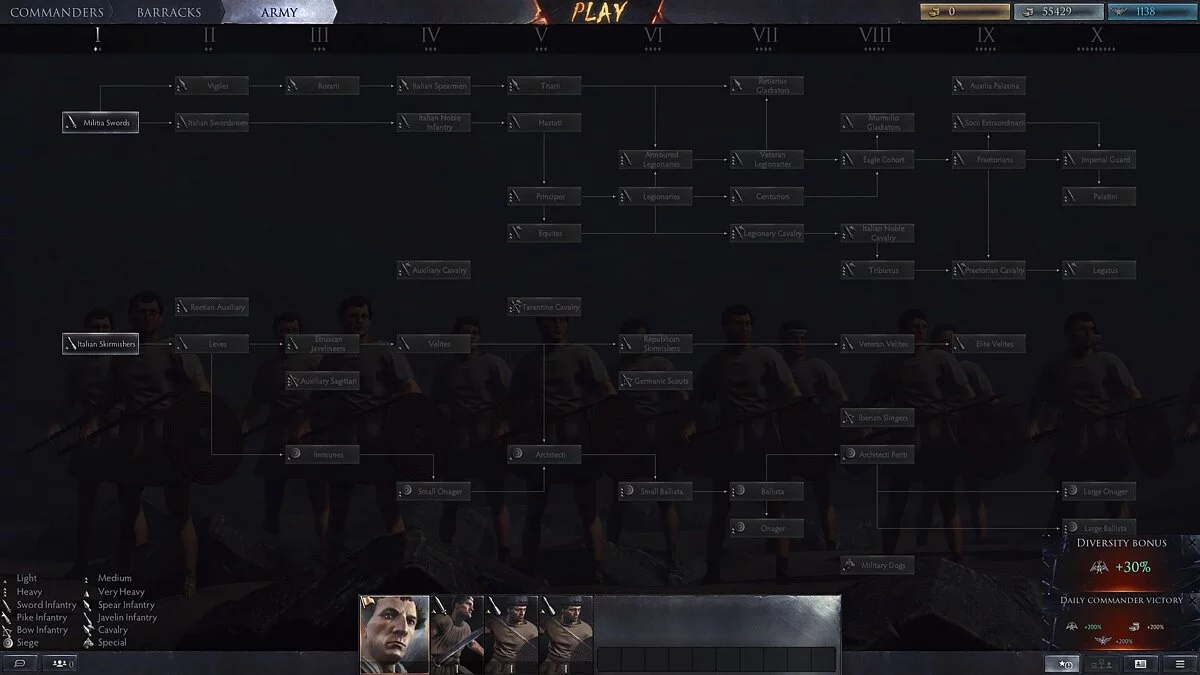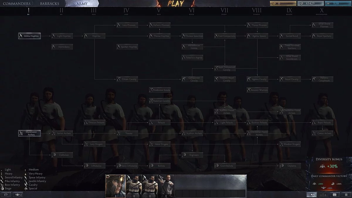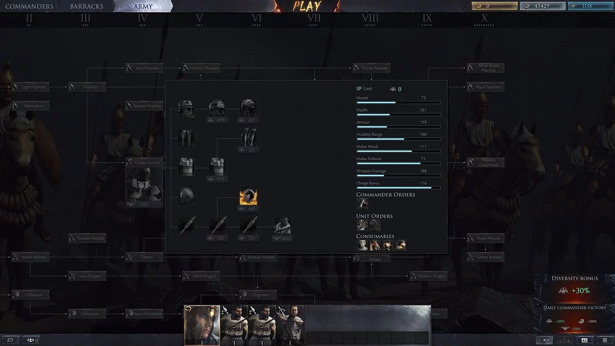 Выбор фракции определяет доступные отряды, а выбор полководца — ту или иную тактику на поле боя, поскольку у каждого полководца есть свои собственные умения, улучшающие либо поведение армии на поле боя, либо усиливающие юниты под его контролем. На текущий момент отрядов у Рима и Греков уже достаточно много — целых 10 линий или уровней, а вот варвары пока отстают — у них только 5 линий юнитов.