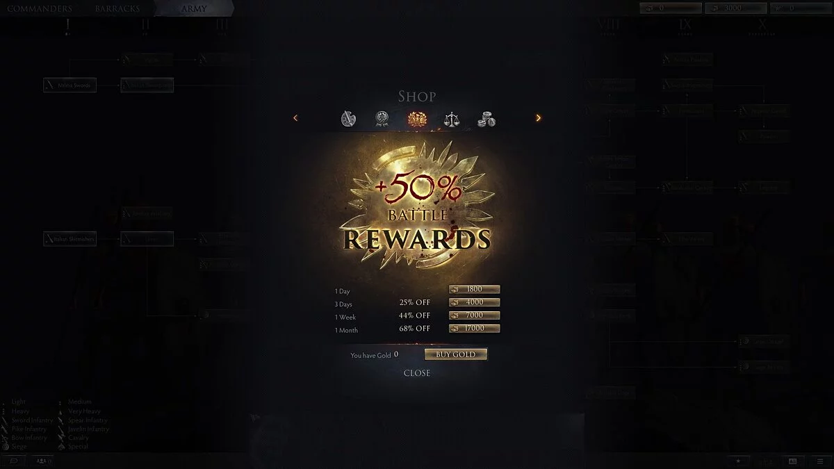 И тут на помощь должно прийти золото — оно является прямым эквивалентом реальных долларов, которые вы готовы вложить в Total War: Arena. По факту, ничего не мешает конвертировать доллары в опыт и внутриигровую валюту напрямую. Другое дело, что это станет явной монетизацией в духе «плати, чтобы побеждать», а это не понравится игрокам. Поэтому золото стало эдакой прокладкой, позволяющей и на пенек сесть и рыбку съесть. Также золото можно потратить на усилители, например, получить +50% к вознаграждениям в течение недели или месяца, что заметно увеличит приток опыта и обычной внутриигровой валюты.