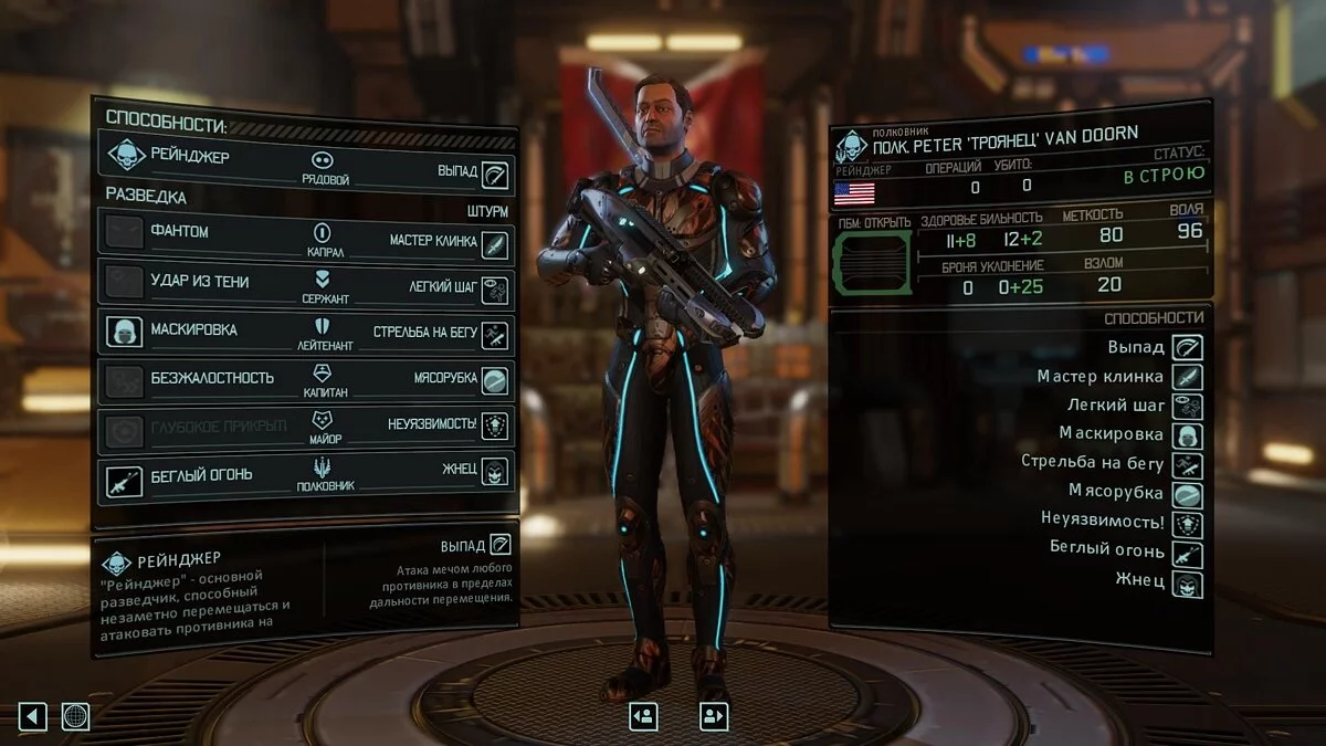 Если вы мечтали о мощном рейнджере, то Ван Доорн будет отличным выбором, ведь у него открыты две ветки способностей, он носит броню «Призрак», обладает фантастическими способностями к маскировке, а штурмовая винтовка и улучшенный тепловой меч несут смерть инопланетянам!