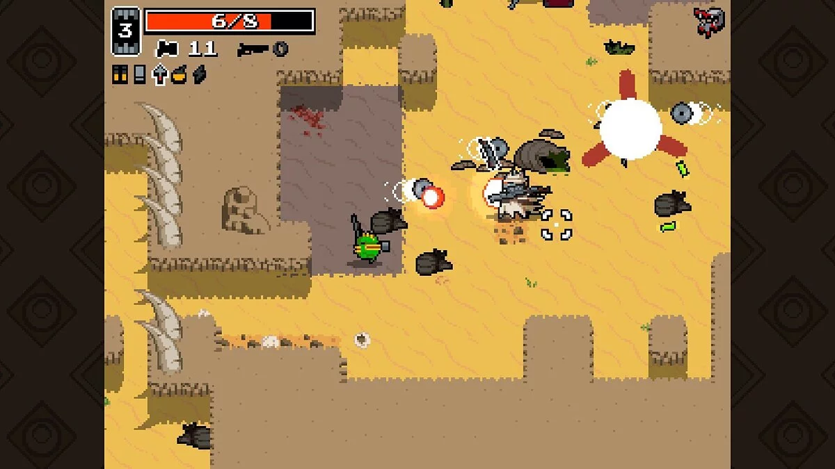 Nuclear Throne в той версии, в которой увидел её я, представляет собой бодрый bullet hell. Переведя это выражение, вы получите фразу, характеризующую игры, где в вашего персонажа выпускают столько пуль, что они застилают собой большую часть экрана. Что бы вы не делали, скорее всего, персонаж схватит хотя бы одну в ограниченном экраном пространстве — и тут остаётся надеяться либо на высокий уровень здоровья, либо щит-улучшение. Либо грамотно пользоваться укрытиями и стрелять, как Клинт Иствуд (Clint Eastwood).