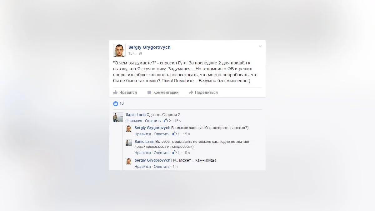 Например, иногда S.T.A.L.K.E.R. 2 мелькает в комментариях на официальной странице Григоровича в социальной сети Facebook. В такие моменты он легко может опровергнуть возможность выпуска продолжения и положить конец ожиданию. Но он, конечно, этого не делает. И все знают, почему.