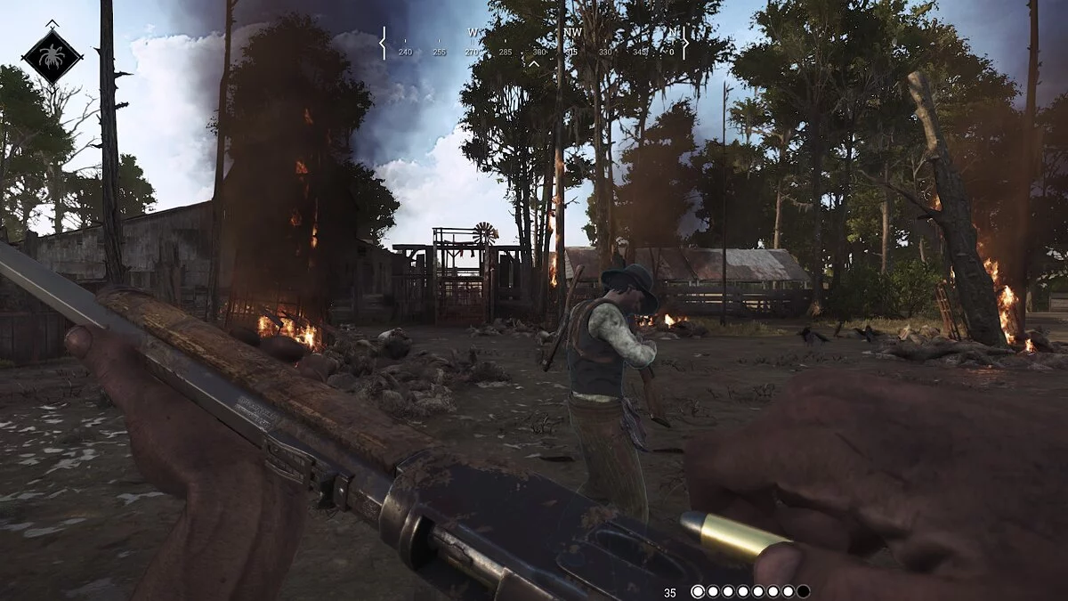...А еще полумертвых лошадей, собак, куриц и вообще все, что может издавать звуки, в том числе разбросанные тут и там консервную и стеклянную тару. Но вороны — это худшее, что может быть. Если они услышат вас, то взлетят с оголтелым карканьем, которое слышно на всю округу. Чтобы преуспеть в Hunt Showdown, нужно не только метко стрелять, но и двигаться тихо. Очень тихо.