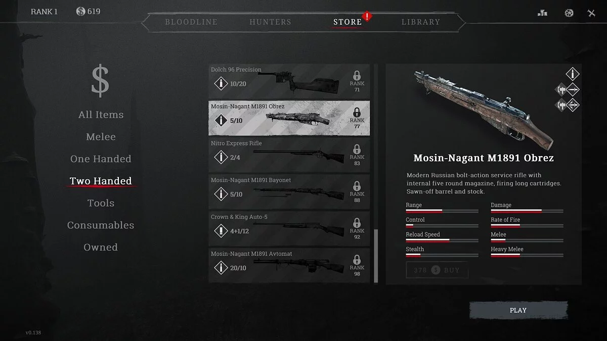 Разумеется, чтобы не шуметь, вам всегда нужно иметь оружие ближнего боя. Нож, мачете, кастет — это отличные варианты для начинающего охотника. На более высоких уровнях вы получите доступ к кастомизированному оружию. Например, можно будет снарядить персонажа гибридом Нагана и кастета или дробовиком-топором. Такое оружие стоит дороже, но при этом совмещает сразу 2 предмета.