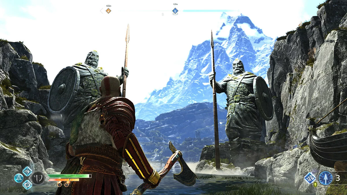 Герои имеют систему прогрессии подобно какой-нибудь RPG. Прокачка способностей происходит за счет очков, получаемых за каждое выполненное задание и убийство врага. За такие очки мы можем развить у Кратоса и его сына различные комбо-атаки, а также изучить новые приемы владения щитом и луком. Основным оружием главного героя является топор Левиафан, который подобно Мьёльниру Тора может возвращаться к владельцу, где бы тот ни находился. Разработчики умудрились даже историю для этого топора состряпать, что лишний раз подтверждает тщательное внимание даже к самым мелким деталям. Топор можно прокачивать, вставляя в него руны и меняя рукоятки. Руны дают Кратосу специальные способности, вроде заморозки врагов или метания топора в группу противников. Рукоять в свою очередь наделяет оружие новыми свойствами и увеличением урона. Как и почти в любой другой RPG, система прогрессии движется попутно с развитием сюжета. К примеру, первые десять часов игры нам почти не дают доступа к крутым рунам и предметам.