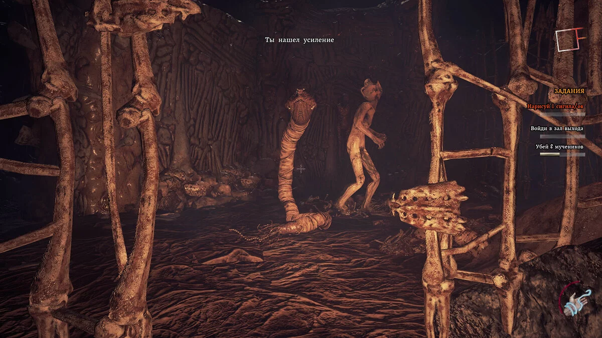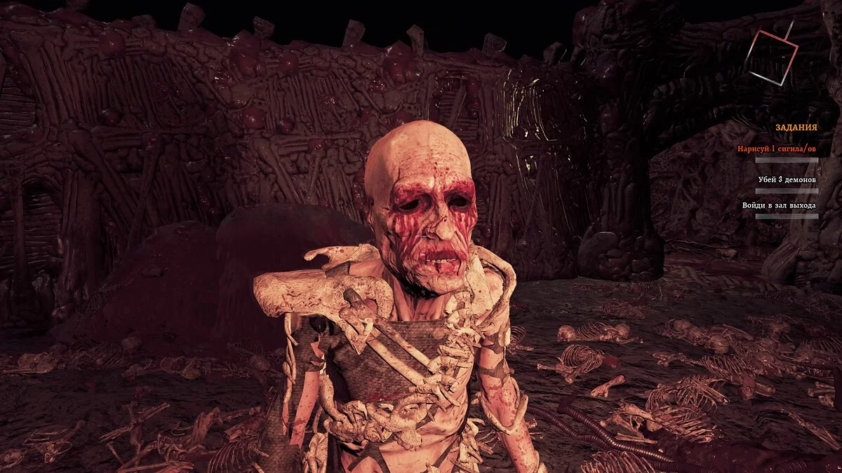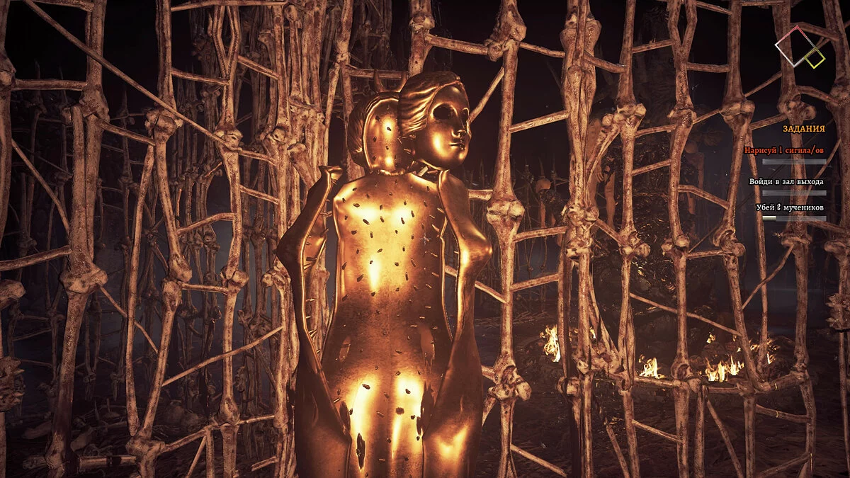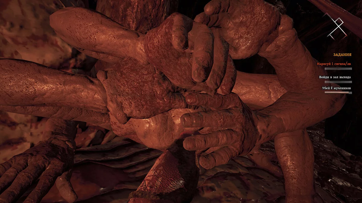 Также в игре придумали специальную систему, благодаря которой можно открывать некоторые двери. Выполнено все следующим образом: ищем сигил (рисунок), после чего подходим к двери и рисуем его при помощи аналоговых стиков. Поначалу такая механика выглядит необычной, но чем дальше проходишь Agony, тем сильнее она начинает напрягать. Иногда сигилов несколько, из-за чего поиск подходящего скатывается в скучное рисование на стенах.