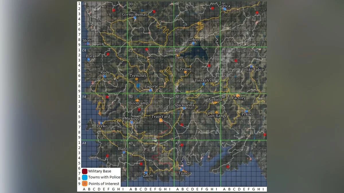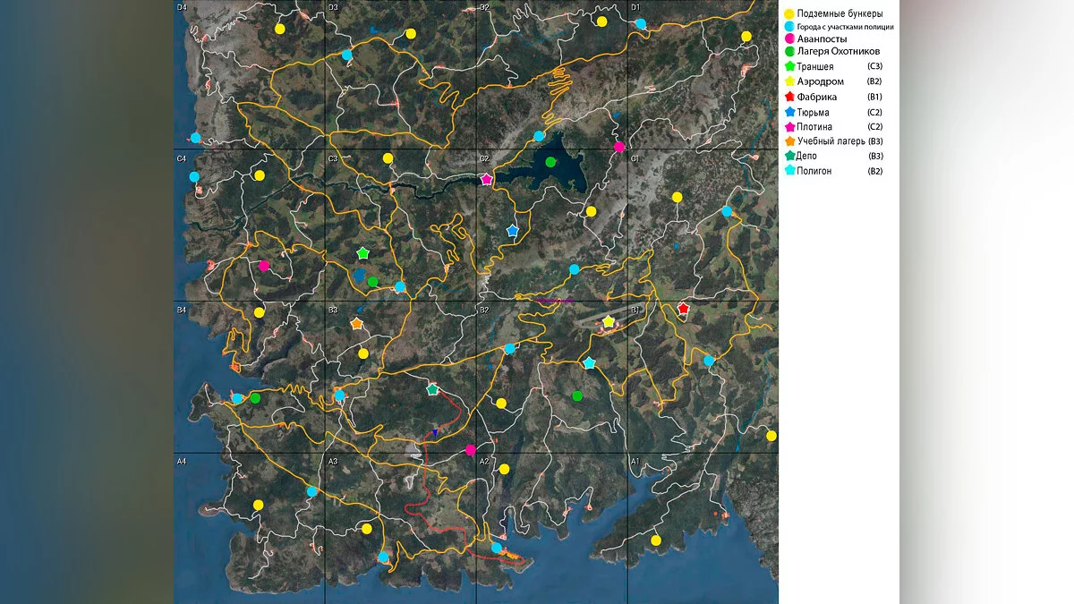 Чтобы открыть карту в игре нажимаем кнопку «M». На карте можно найти: подземные бункеры, маленькие поселения (отделения полиции есть не во всех поселениях), аванпосты, лагеря охотников, траншею, аэродром, фабрику, тюрьму, плотину, учебный лагерь, депо и полигон.
