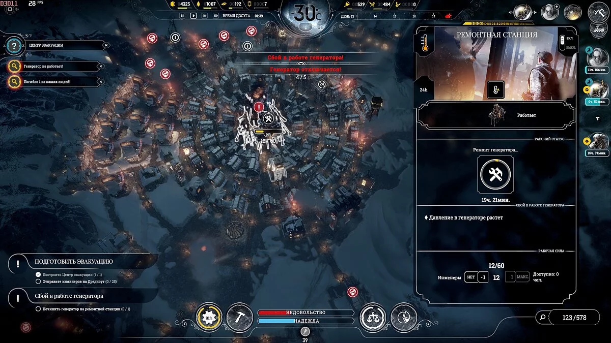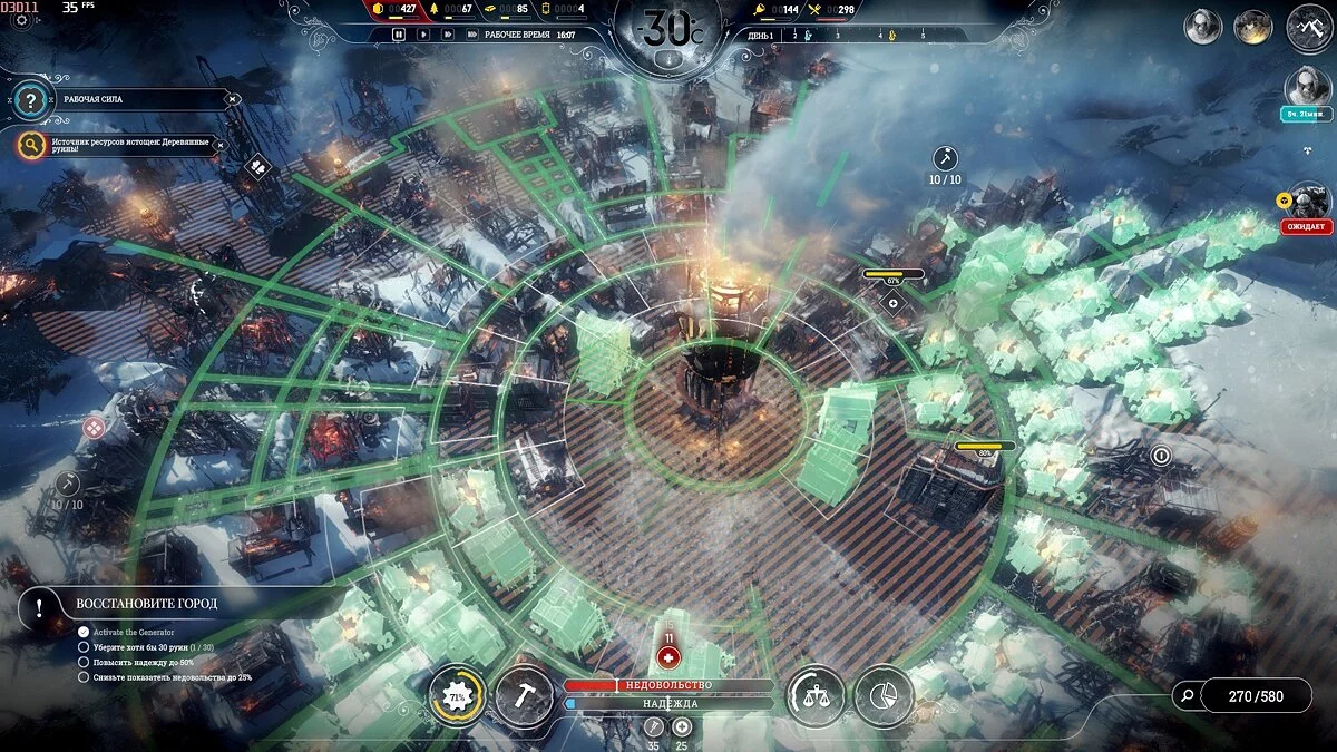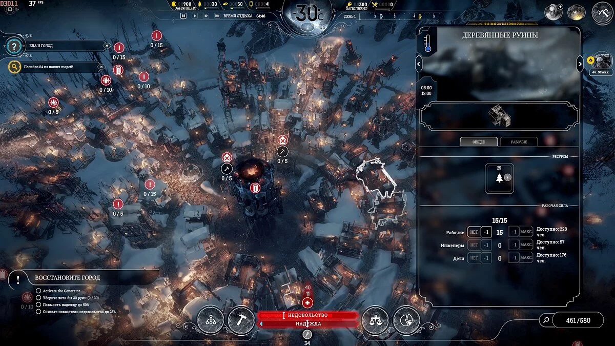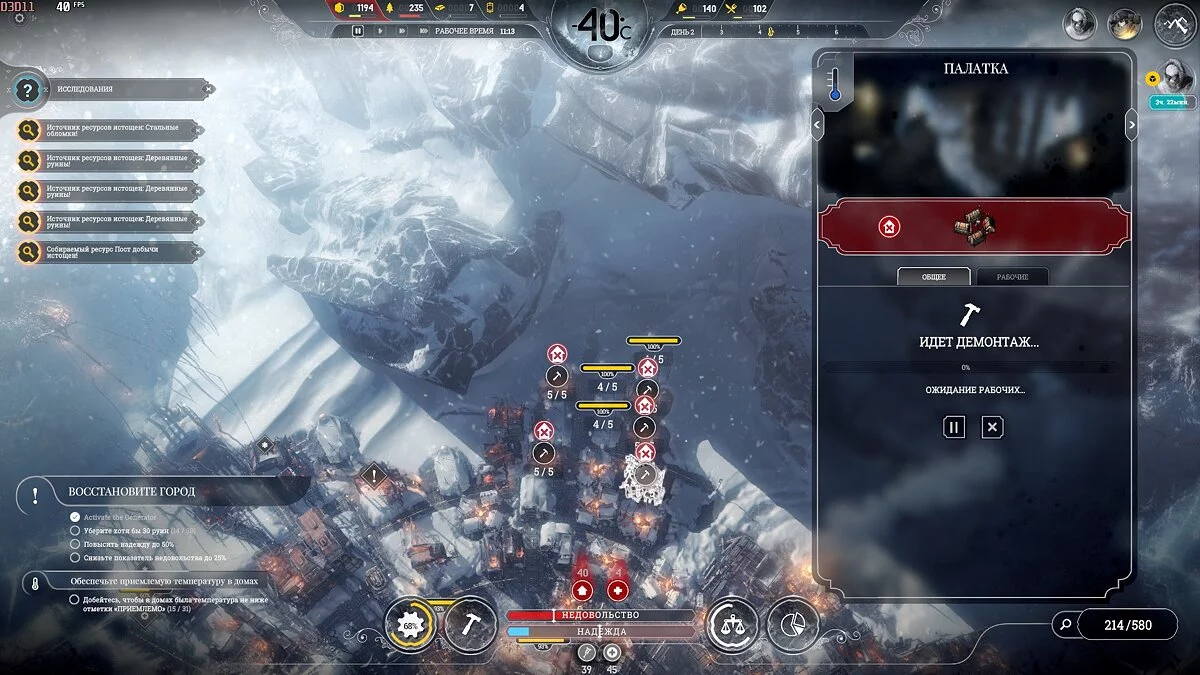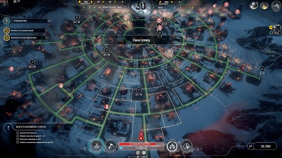 Расчистка завалов займет 3-4 дня, но следите, чтобы люди не работали при -40 °С и ниже — только прибавите больных. При правильном размещении Постов добычи, можно оперативно разобрать все руины и сохранить здоровье людей.