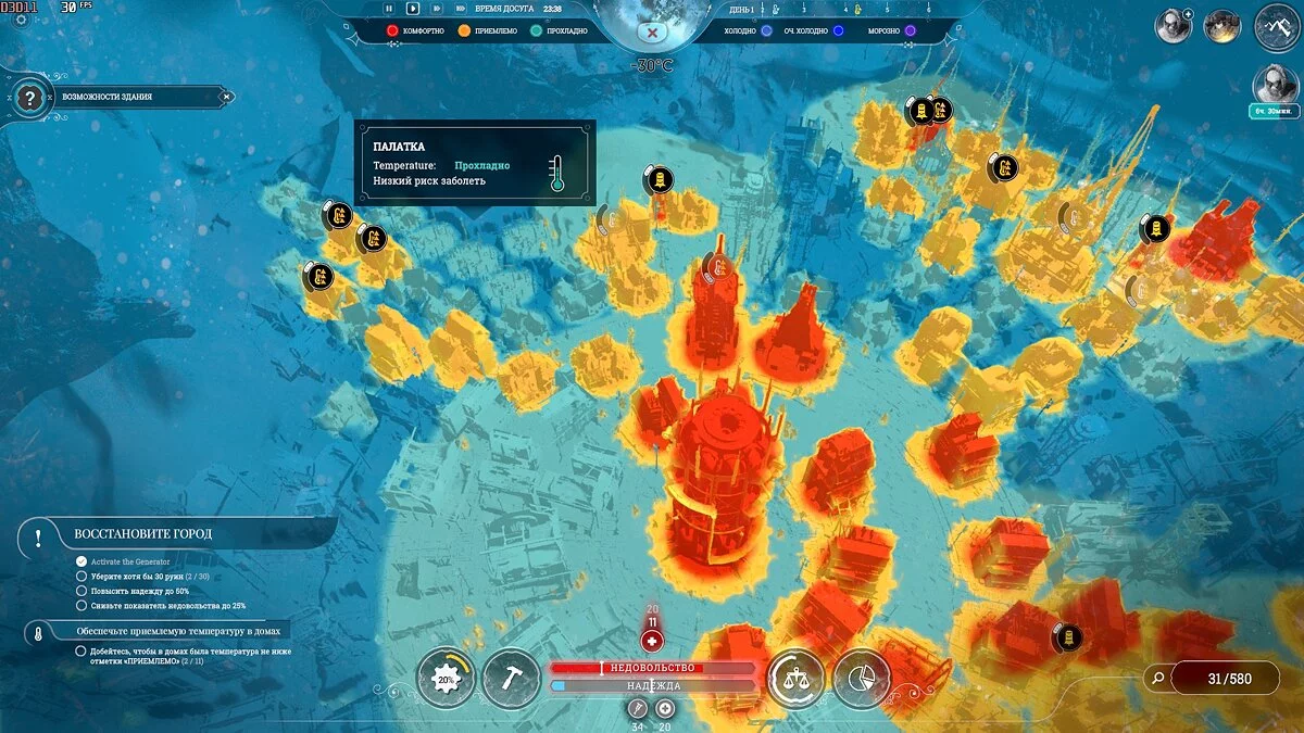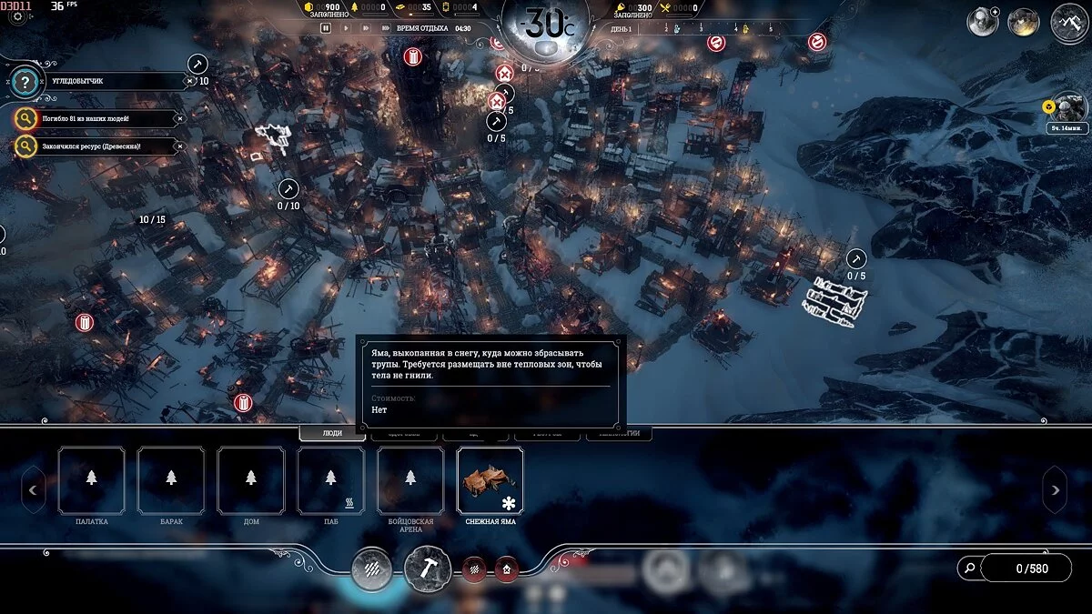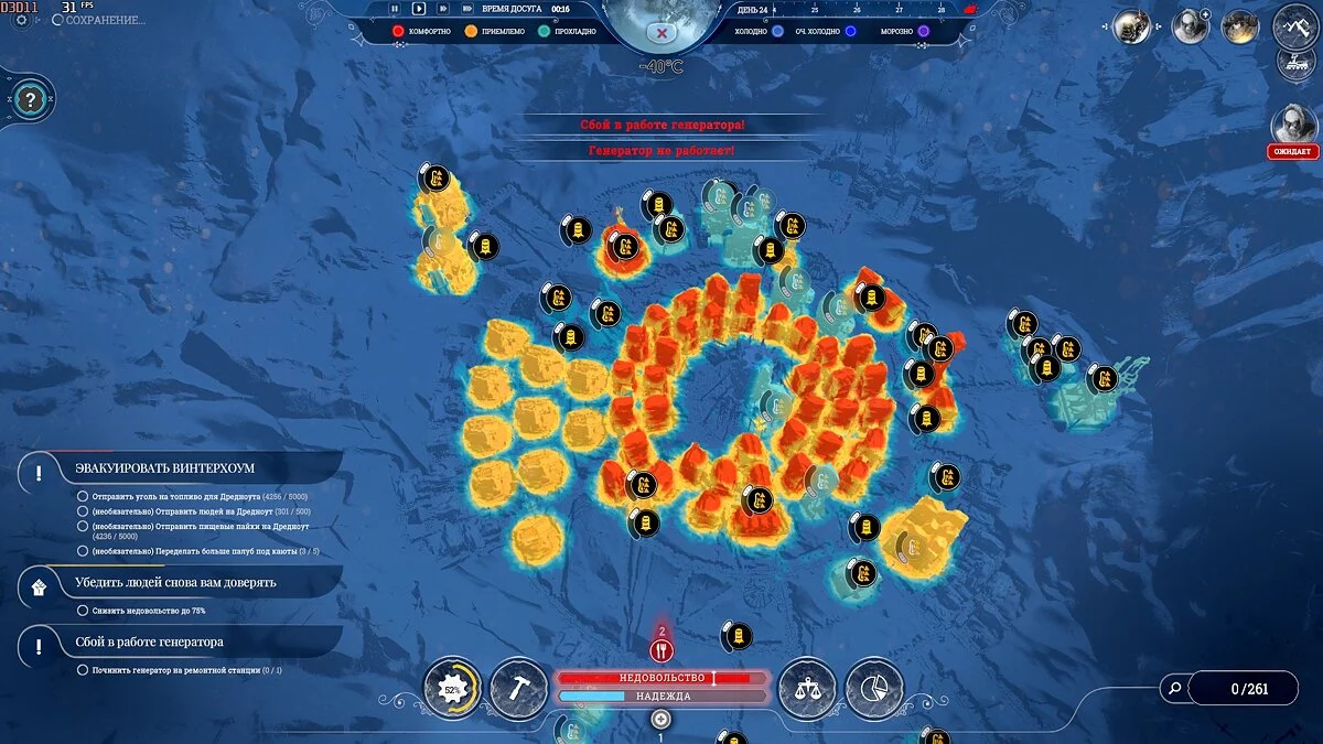 По тепловой карте определите, что население живет в палатках далеко от Генератора. Важно переместить людей к нему, обратно, убрав как руины, так и здания — Паб, Бойцовская Арена и Кухня (не нужны). В углу карты постройте новую Снежную яму и сразу же уберите ту, что стоит рядом с Генератором.