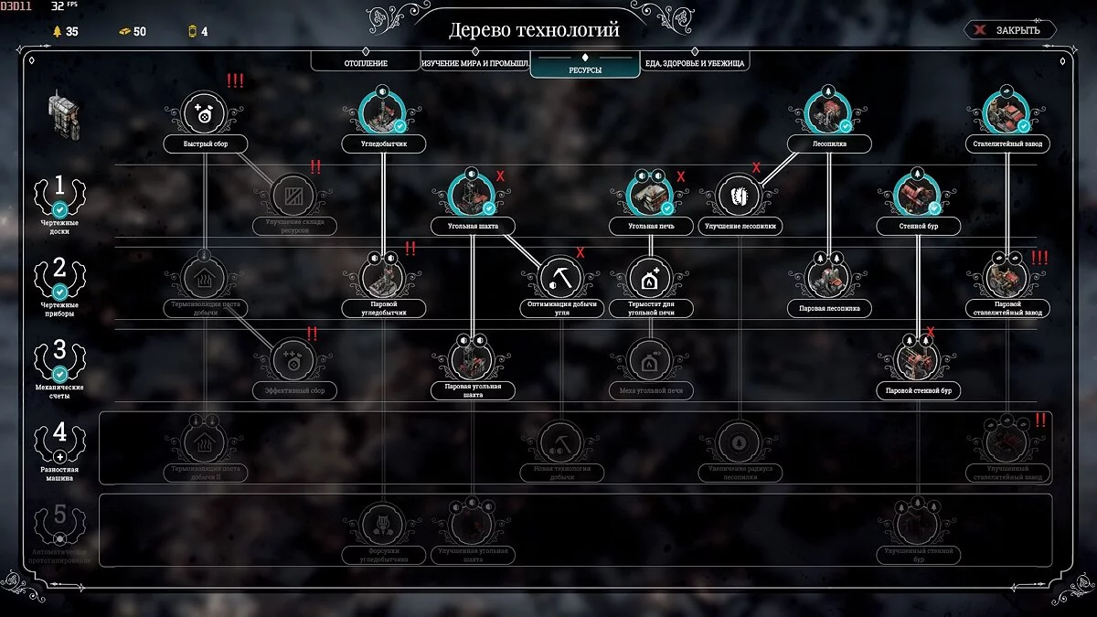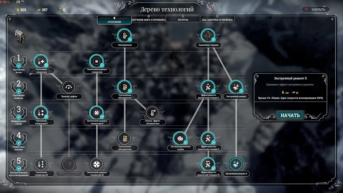С этой же целью первые пять исследований в мастерской таковы: Улучшение санитарного пункта, Быстрый сбор, Лазарет, Механизация лазарета, Тактика охоты. Обратите внимание, что древо технологий открыто уже хорошо, но из-за недостатка инженеров не спешите исследовать все подряд.