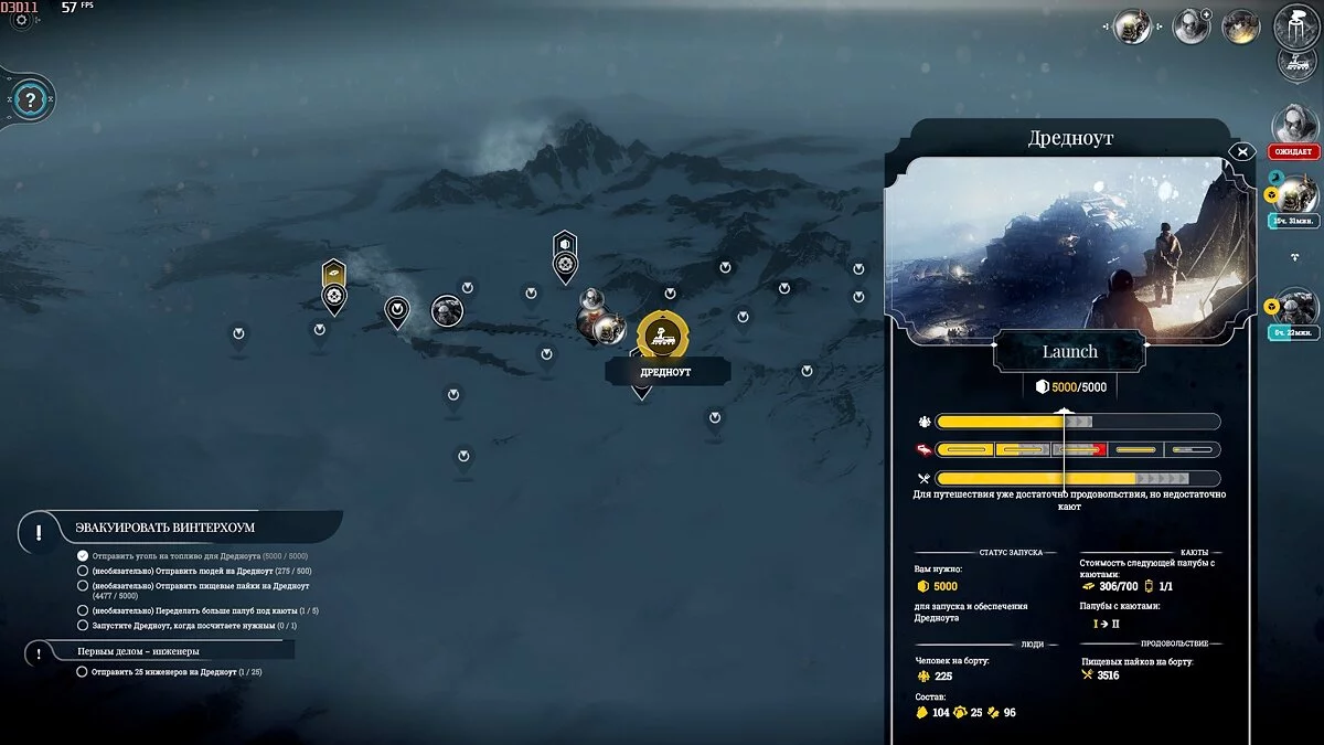 Только первое условие является обязательным, а остальные четыре нужно выполнить равноценно — инженеры будут расчищать палубы Дредноута и строить в них жилье и склады, так что всё требуется поставлять в пропорциональных количествах.
