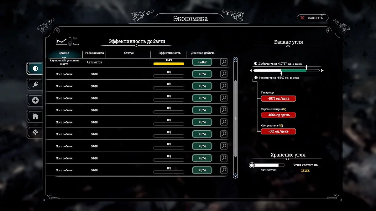 В заключение хотим напомнить, что запасов угля в 20 000 единиц достаточно для уверенного прохождения любого сценария, достигнув этот уровень вы можете больше не использовать угледобытчики вообще, а только шахты.