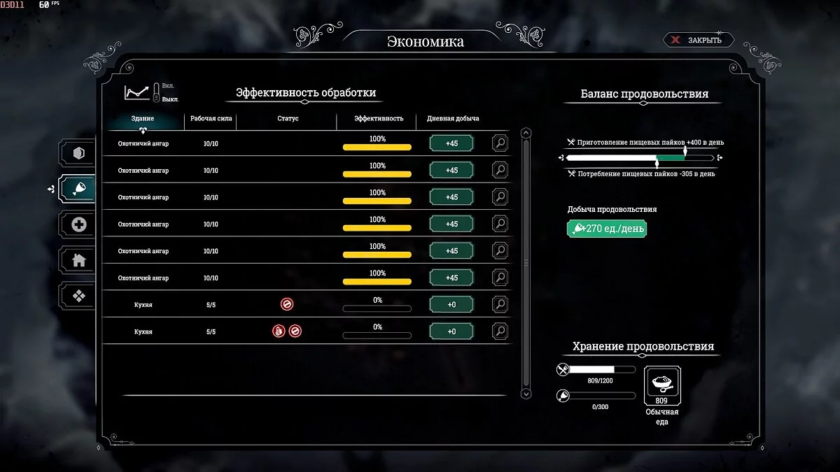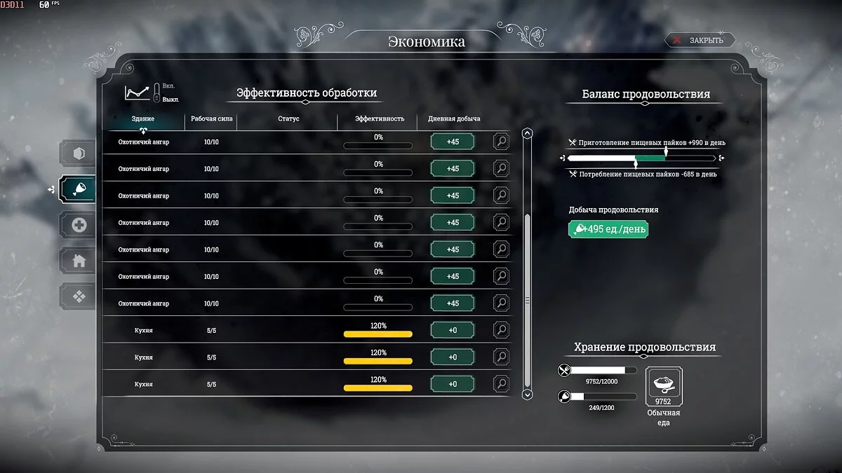 Регулярно смотрите на динамику хранения складских запасов сырой еды и сухпайков — когда она начинает падать, добавляйте еще одно здание с охотниками:
