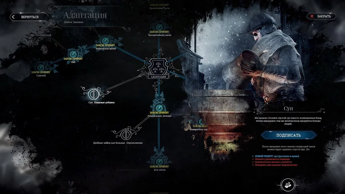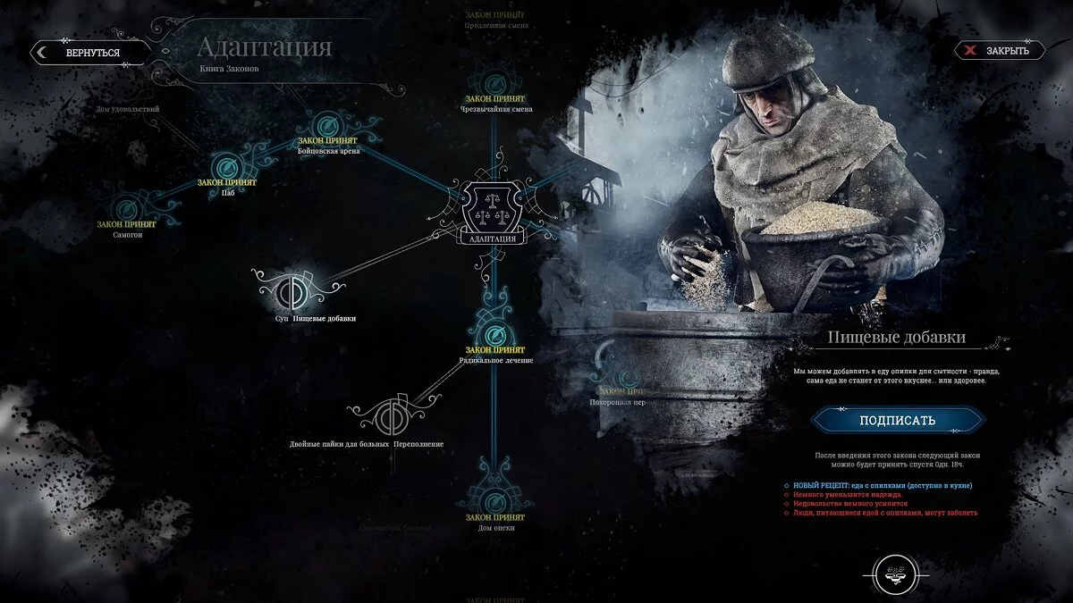 Приняв закон «Пустой суп» или «Добавки-опилки» в древе законов «Адаптация» можно незначительно увеличить количество производимых пайков, но мы бы не рекомендовали этого делать, чтобы не подстегнуть недовольство.