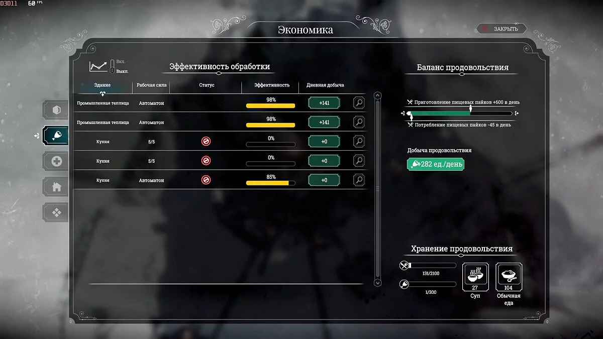 Производительность теплицы невелика — 30 единиц сырой еды в день у обычной, а после всех улучшений — 60. Однако, в отличие от хижины охотников, в теплице может круглые сутки работать автоматон. Тогда её производительность вырастит до 6,8-7,0 сырой еды в час за счет интеграции машины, а в день она будет производить по 141 единицы сырой еды в день. Это, например, пригодится в сценарии «Ковчеги».